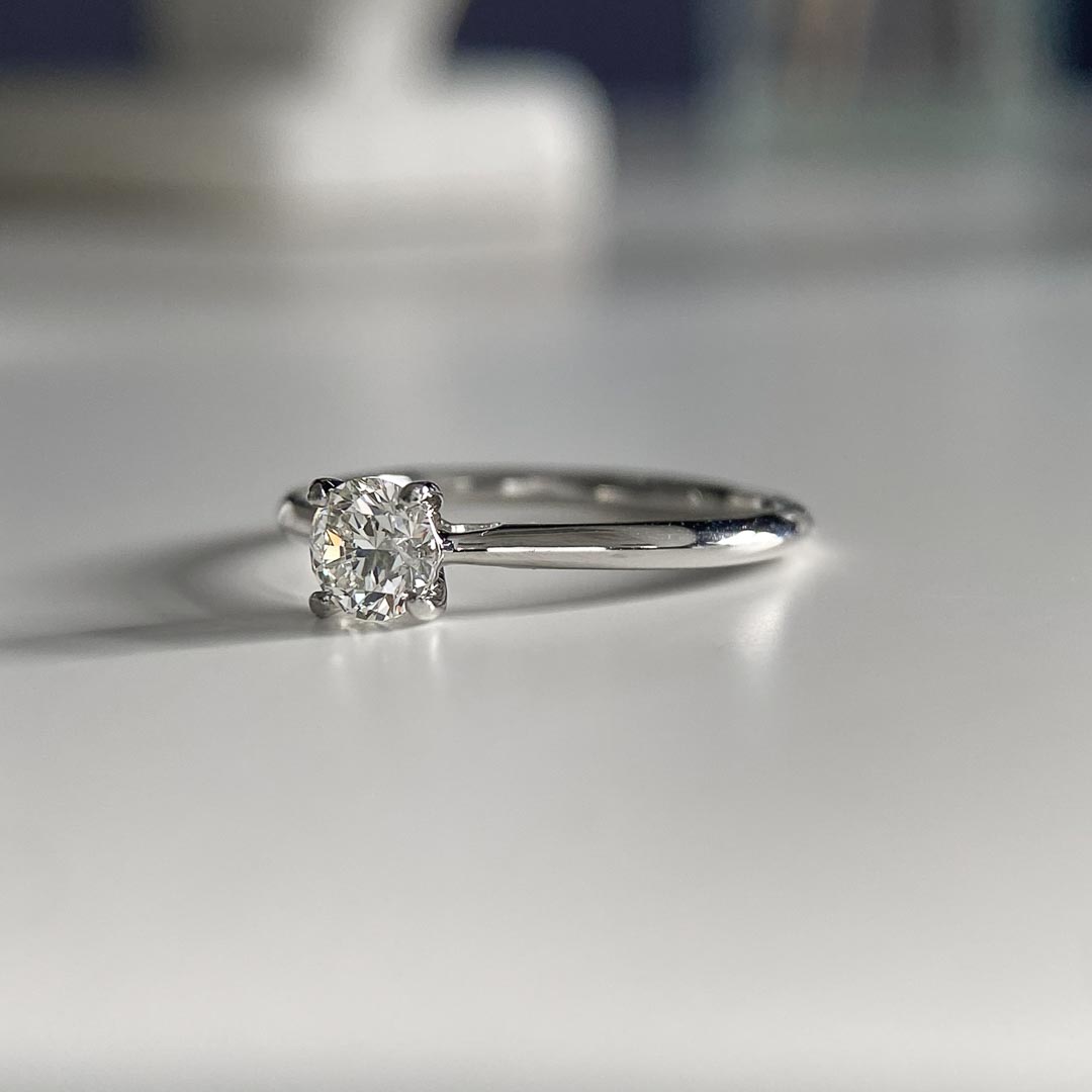 This gorgeous platinum Carys ring features a beautiful quality 0.46ct natural round brilliant diamond; this solitaire ring measures 1.7mm wide.