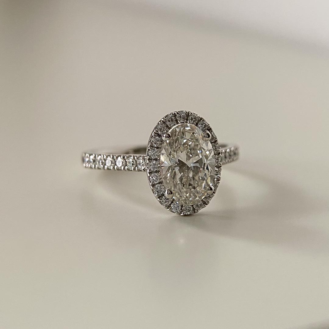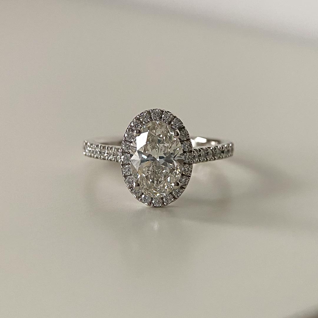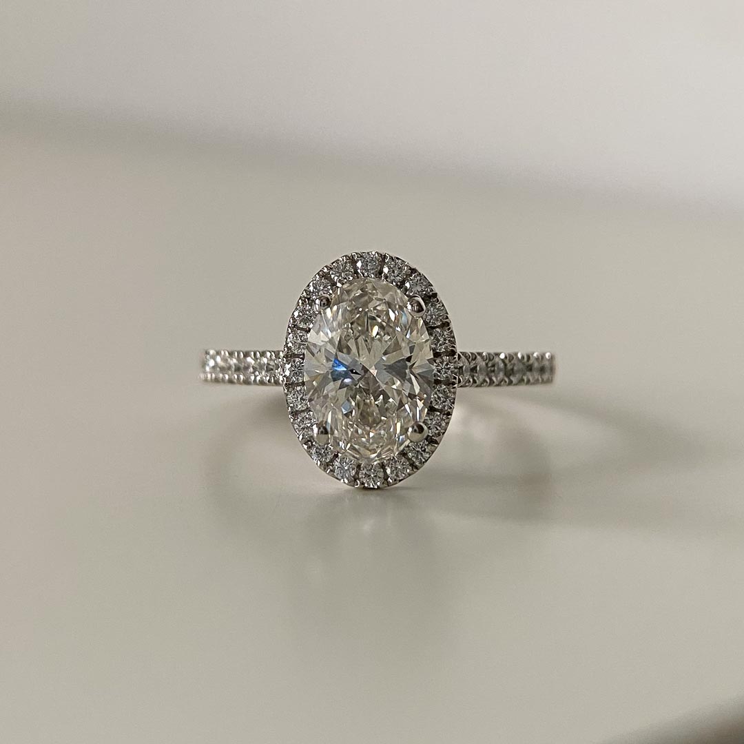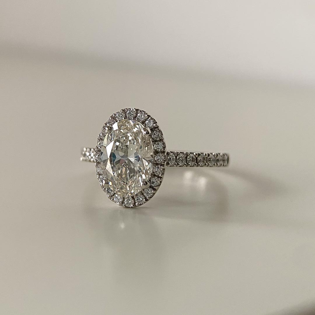 This gorgeous platinum Bijou ring features a beautiful quality 1.90ct lab-grown oval diamond. The diamond set halo ring measures 2mm wide and is micro set with 0.72cts of G/VS quality round brilliant diamonds on the shoulders.