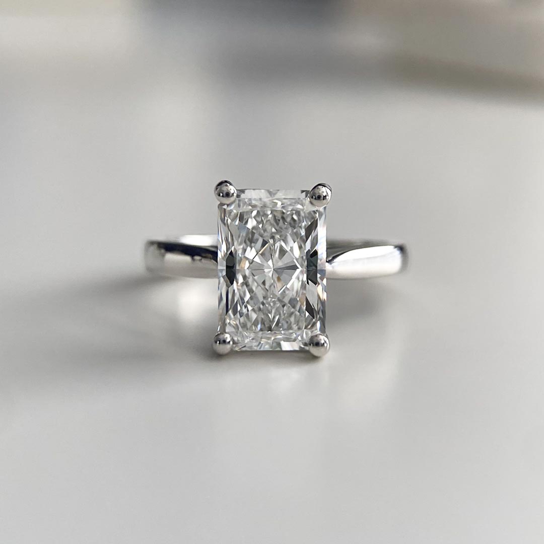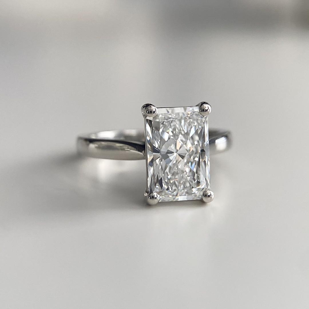 This gorgeous platinum Nara ring features a beautiful quality 2.27ct lab-grown radiant diamond, this solitaire measures 2.2mm wide.