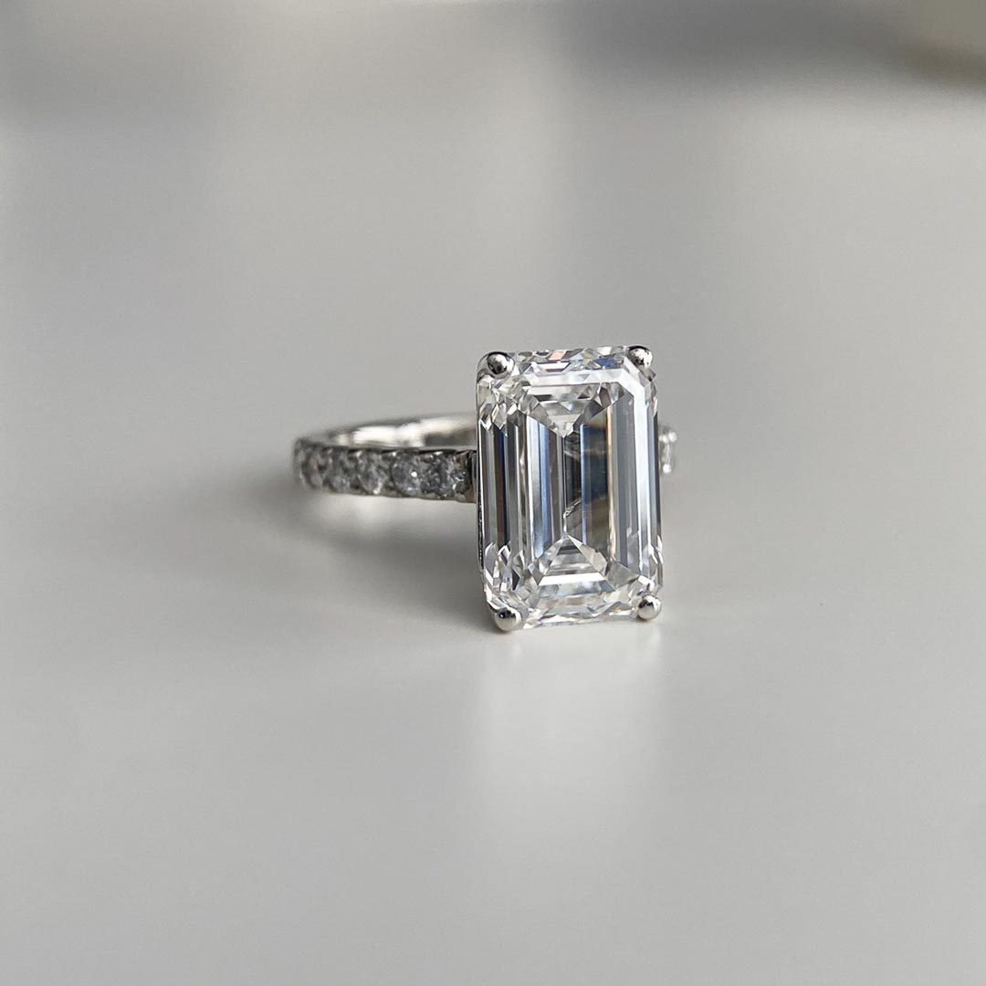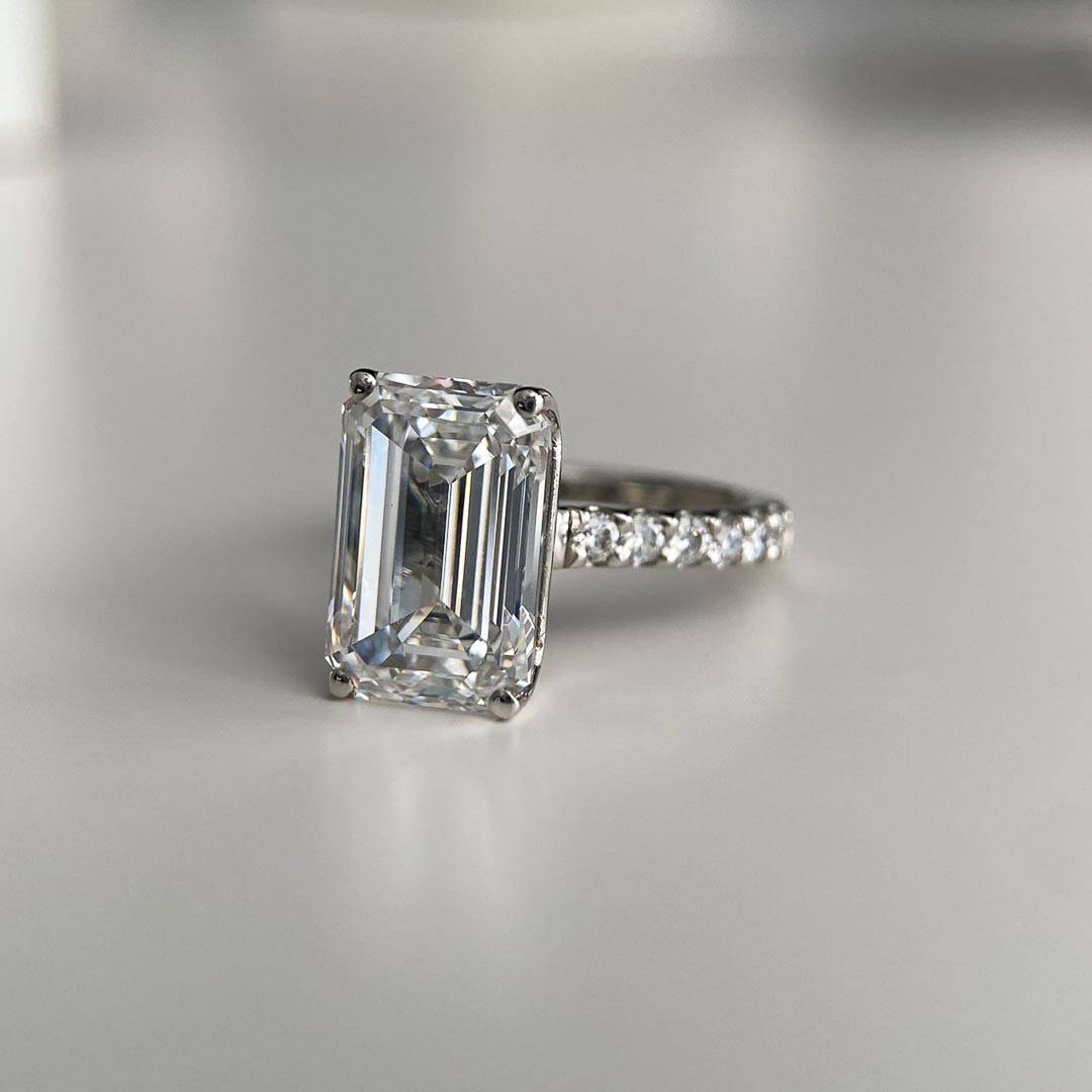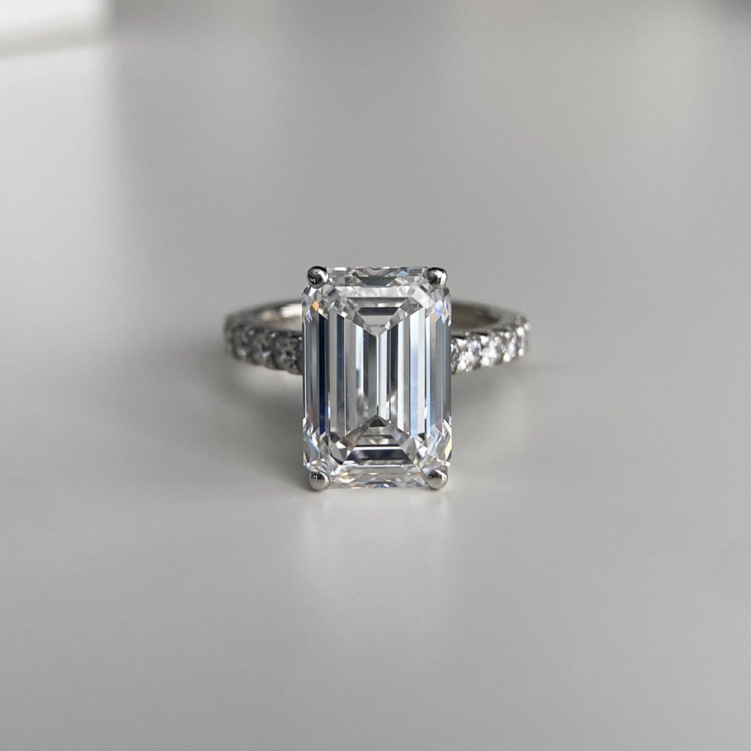 The 5.03ct emerald diamond is independently certified by IGI and handpicked by a diamond expert to have the maximum fire and brilliance befitting a diamond set engagement ring.