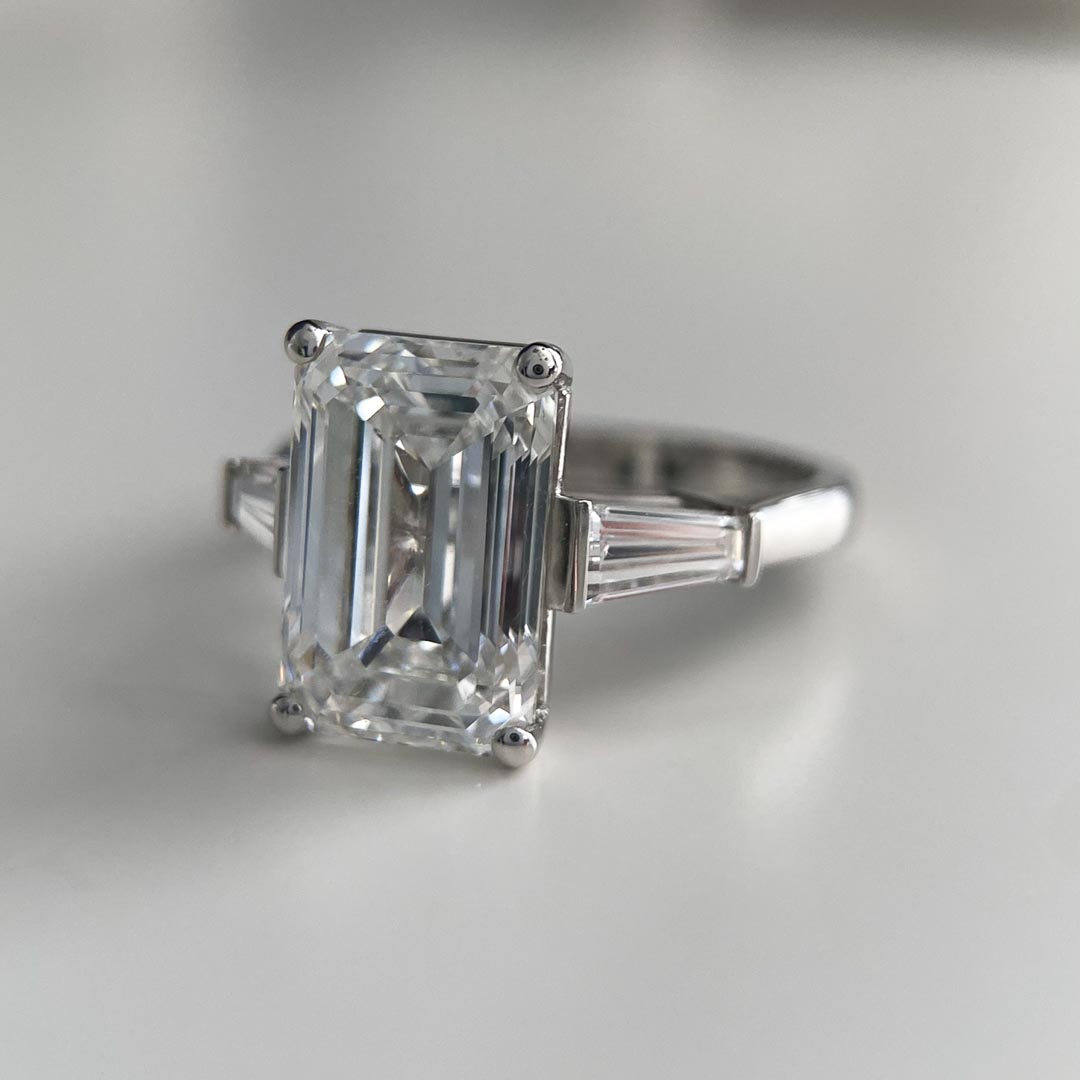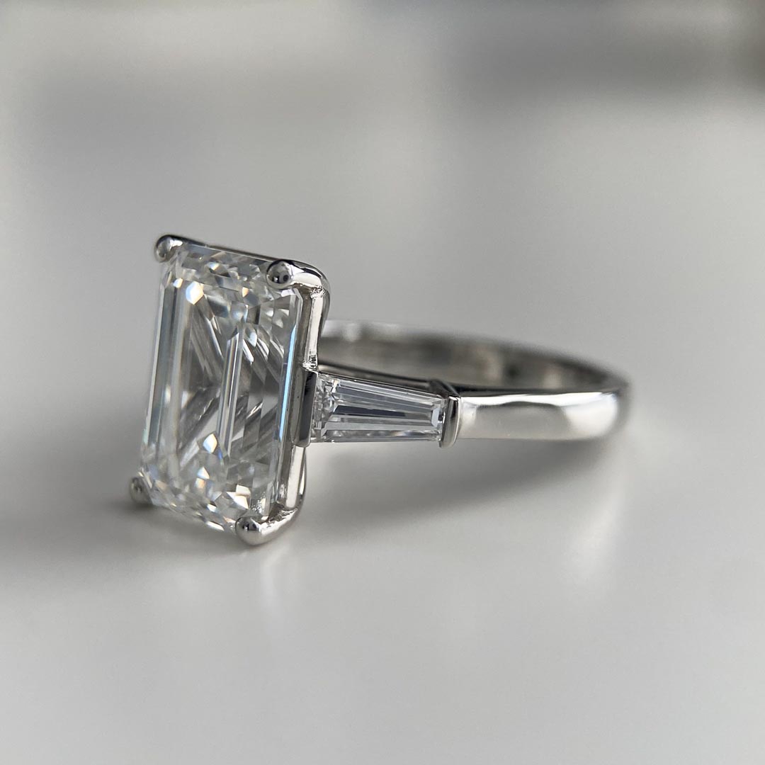 This gorgeous platinum Vida diamond ring features a beautiful quality 5.03ct lab-grown emerald diamond. This trilogy measures 2.3mm wide and is set with 0.26cts of lab-grown E/VS quality tapered baguette cut diamonds on either side of the centrestone, bringing the total carat weight to 5.55cts!