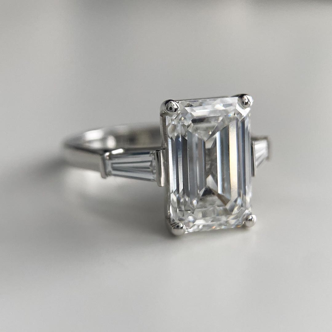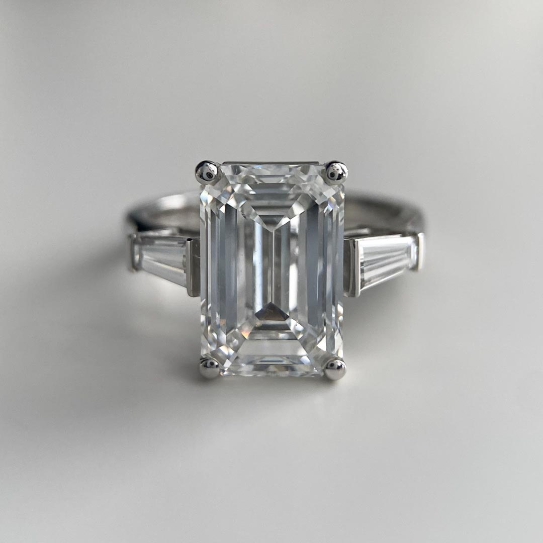 The 5.03ct emerald diamond is independently certified by IGI and handpicked by a diamond expert to have the maximum fire and brilliance befitting a diamond set engagement ring.