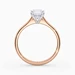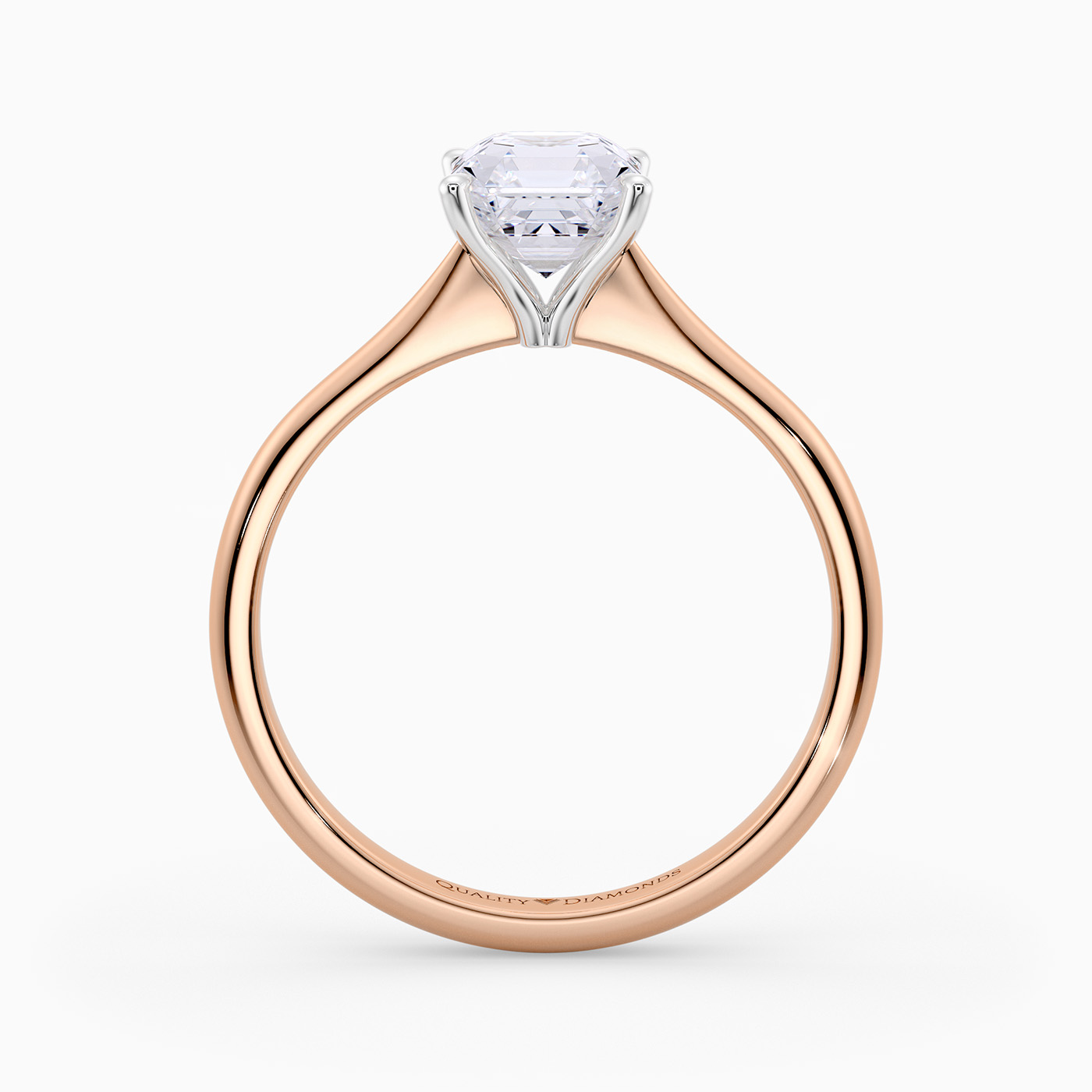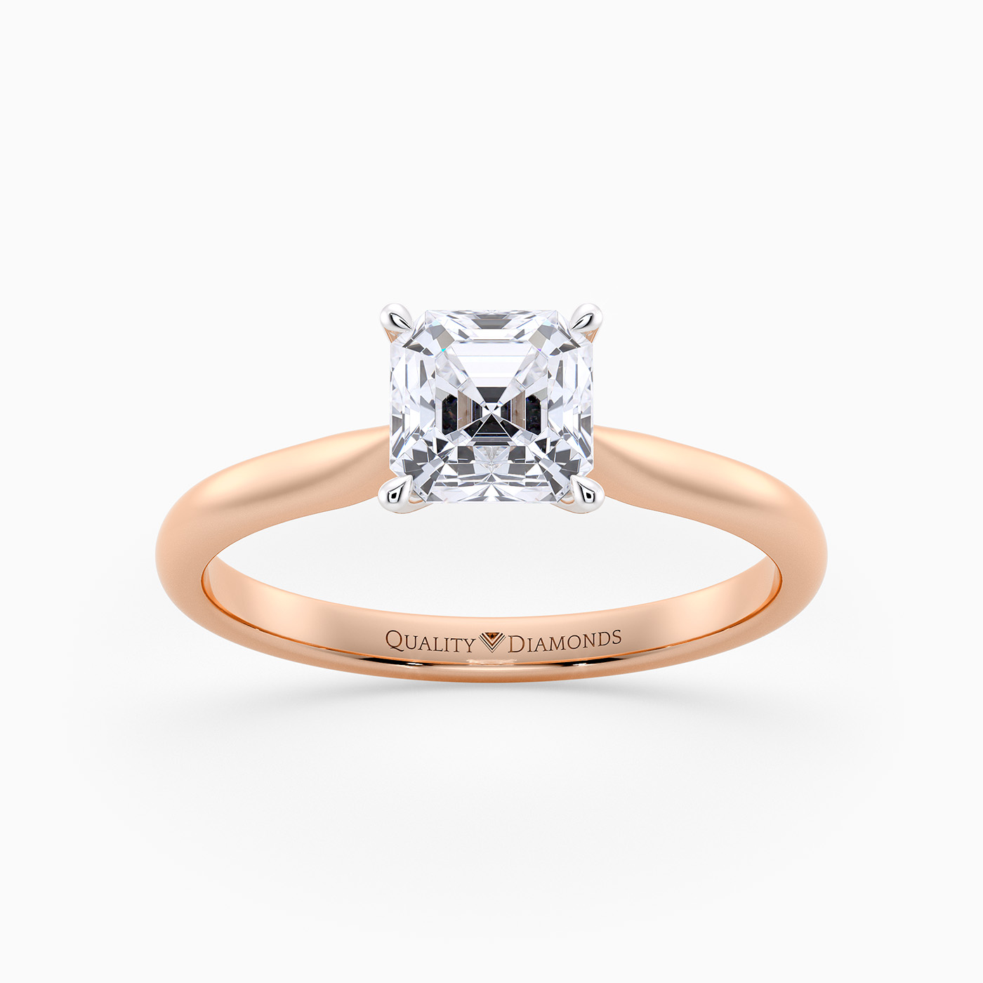Our classic 18K Rose Gold solitaire Beau features an elegant four-claw setting to secure the Asscher diamond, with the claws creating a V shape from the side detail to complement the sparkle. With no side bezel, this setting truly maximises the amount of light able to pass through the diamond.