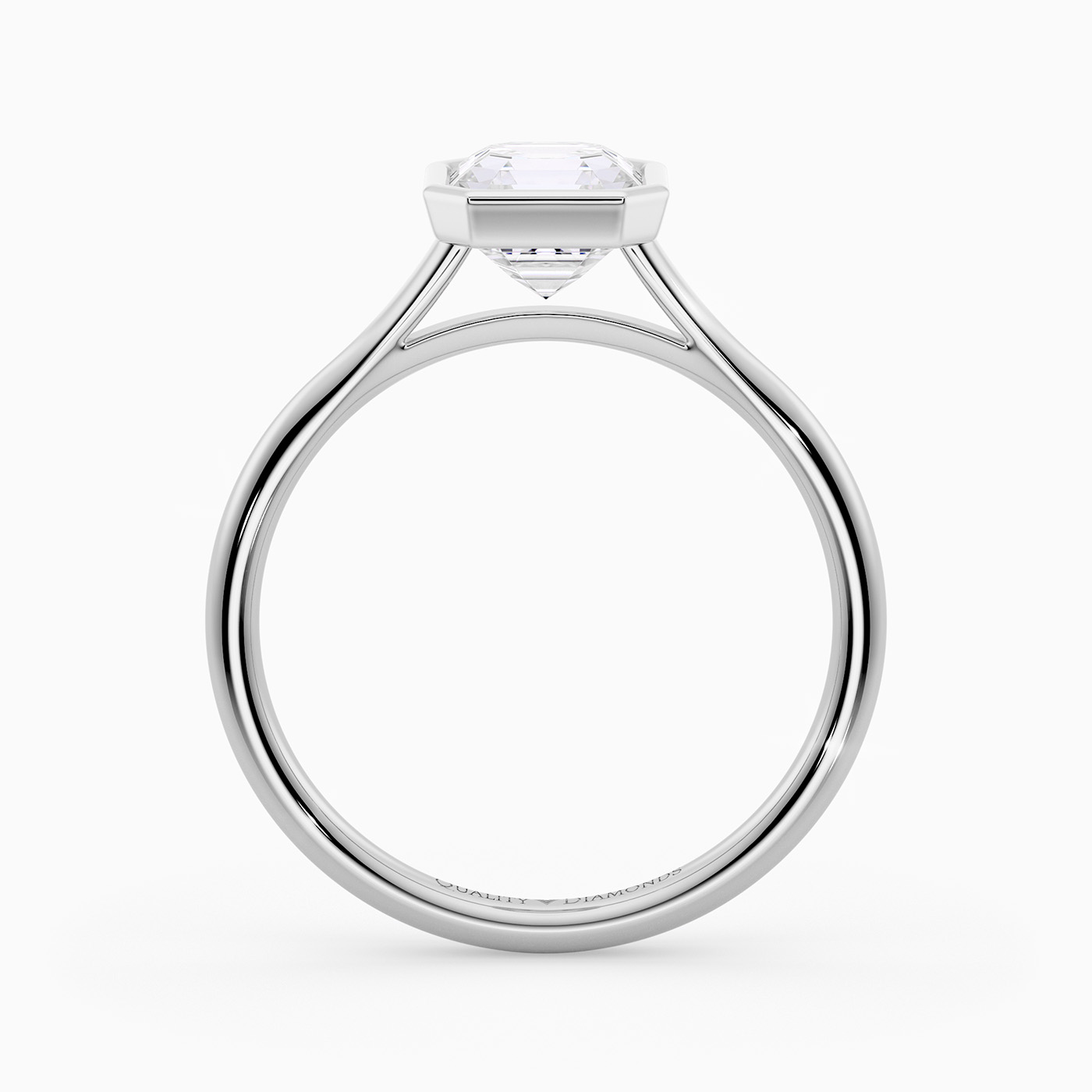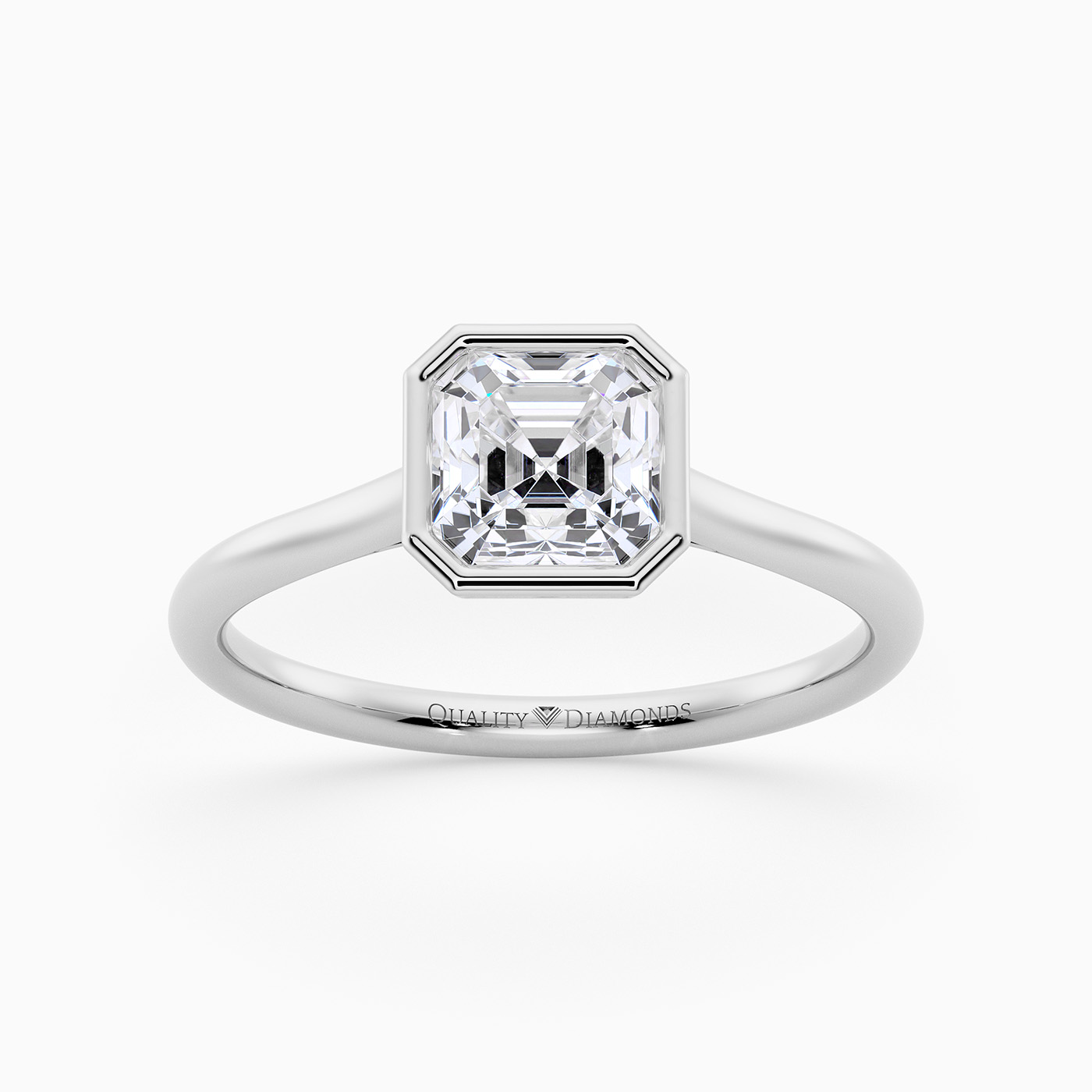 Our contemporary Platinum solitaire Carina holds the Asscher diamond in a modern bezel setting, complementing the elegant design. The rounded band finishes off the contemporary design beautifully.