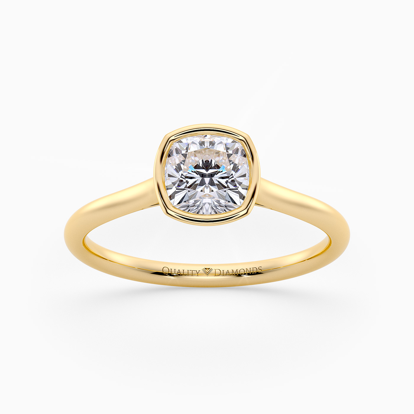 Our contemporary 18K Yellow Gold solitaire Carina holds the Cushion diamond in a modern bezel setting, complementing the elegant design. The rounded band finishes off the contemporary design beautifully.