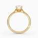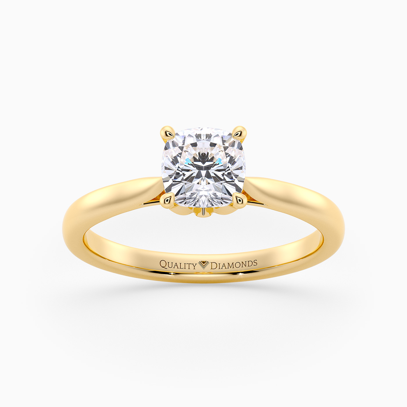Our classic 9K Yellow Gold solitaire Flor features a delicate, sculpted, floral four-claw setting for the Cushion diamond. The classic court-shaped band splits and gently tapers, drawing attention to the diamond.