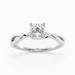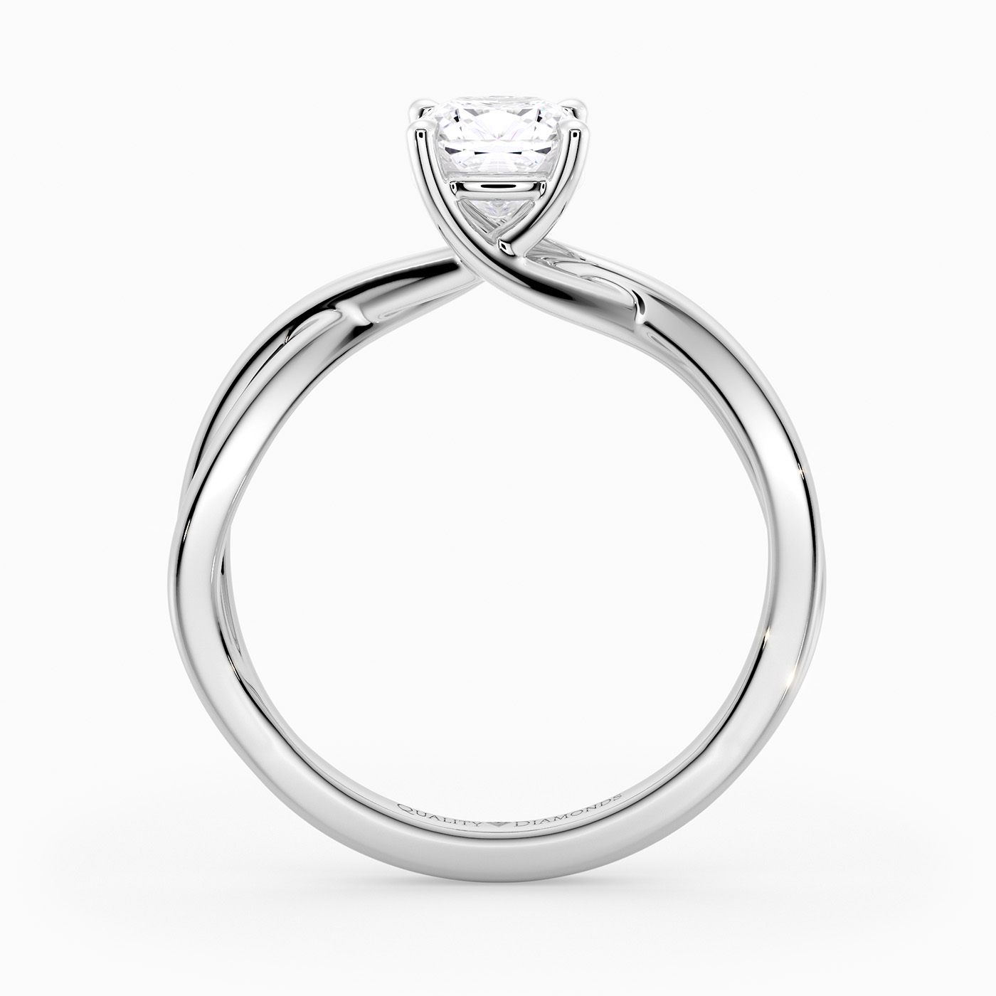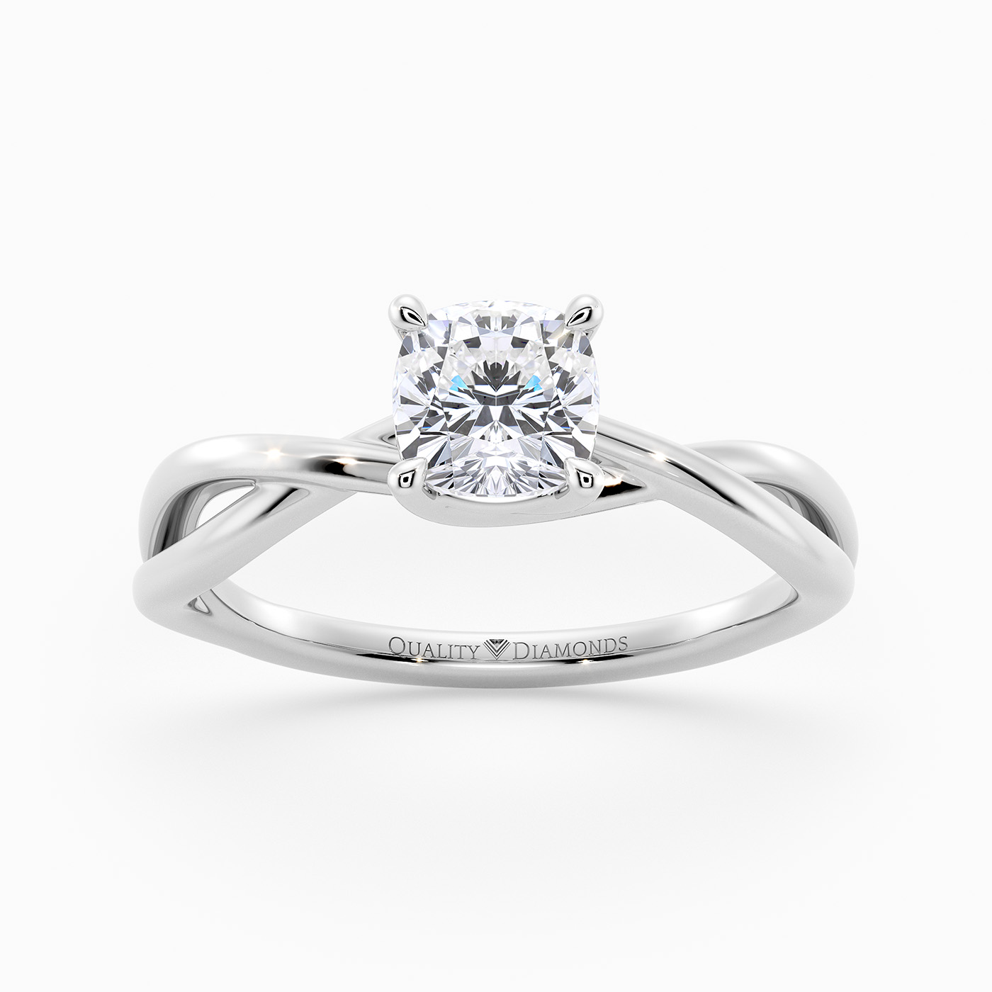Our elegant Platinum solitaire Grazia holds the Cushion diamond in a delicate four-claw organic twist setting, creating a sense of movement and fluidity. The band gently splits as it rises towards the diamond, complementing its sparkle.