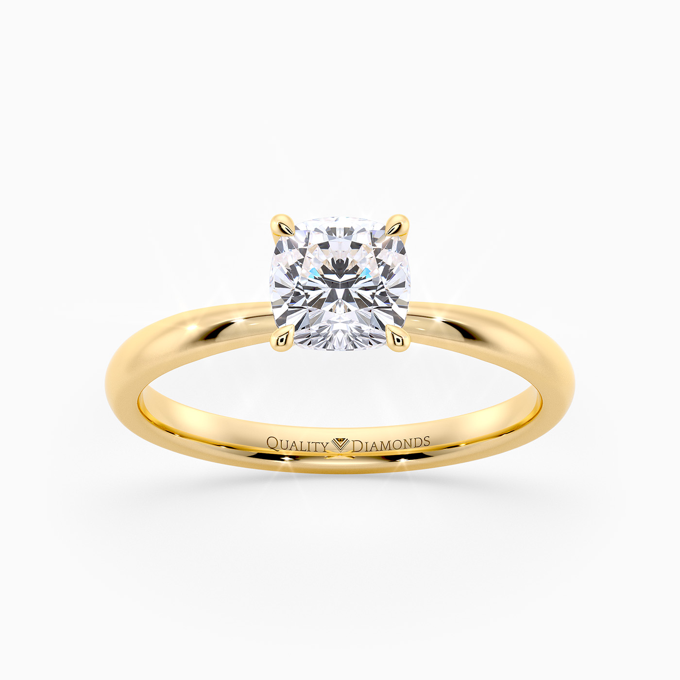 Our classic 18K Yellow Gold solitaire Mirabelle holds the Cushion diamond in an elegant V-shaped four-claw setting, securely cradling the diamond while allowing plenty of light to enter from the sides. The elevated, open setting enhances the stones brilliance and creates a timeless, sophisticated look with simple, flowing lines.