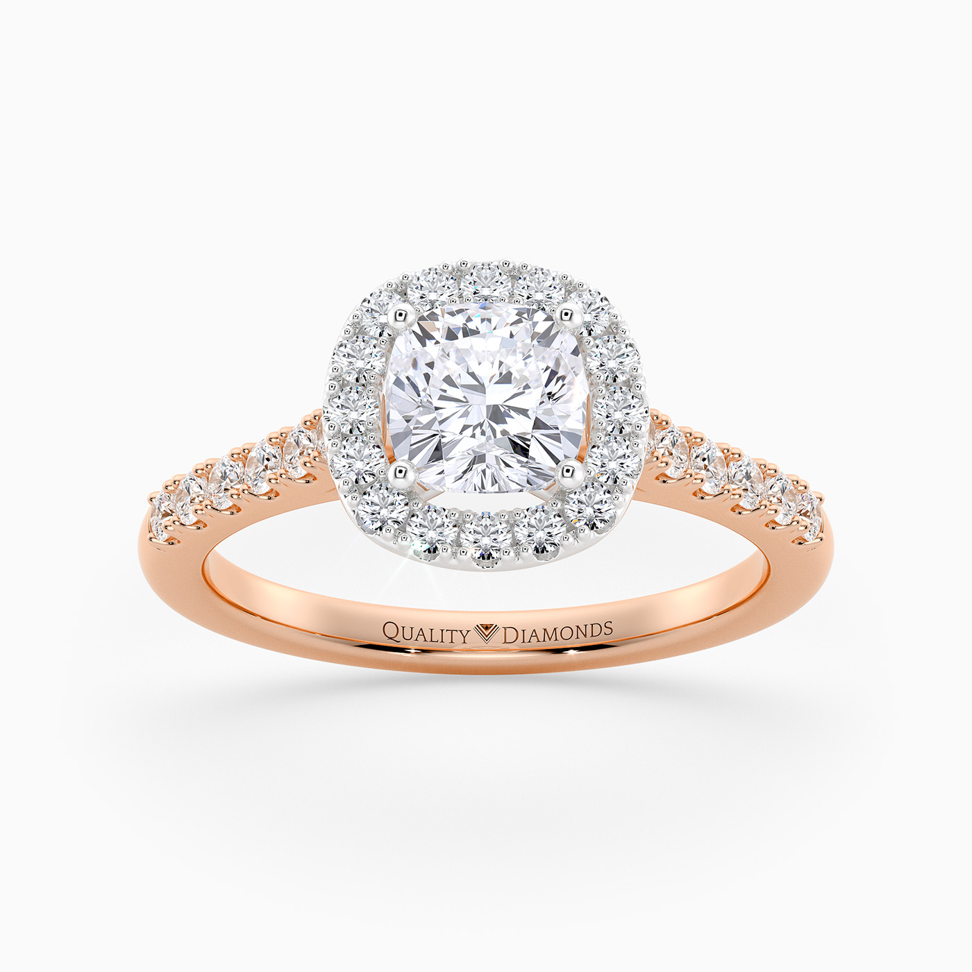 Our Cushion Cut 18K Rose Gold Halo Bijou holds the Central Diamond in a four-claw setting with surrounding brilliant round diamonds micro-pave set in the shoulders. This very Sparkly Vintage Style Design captures the light beautifully, creating a dramatic and eye-catching design.