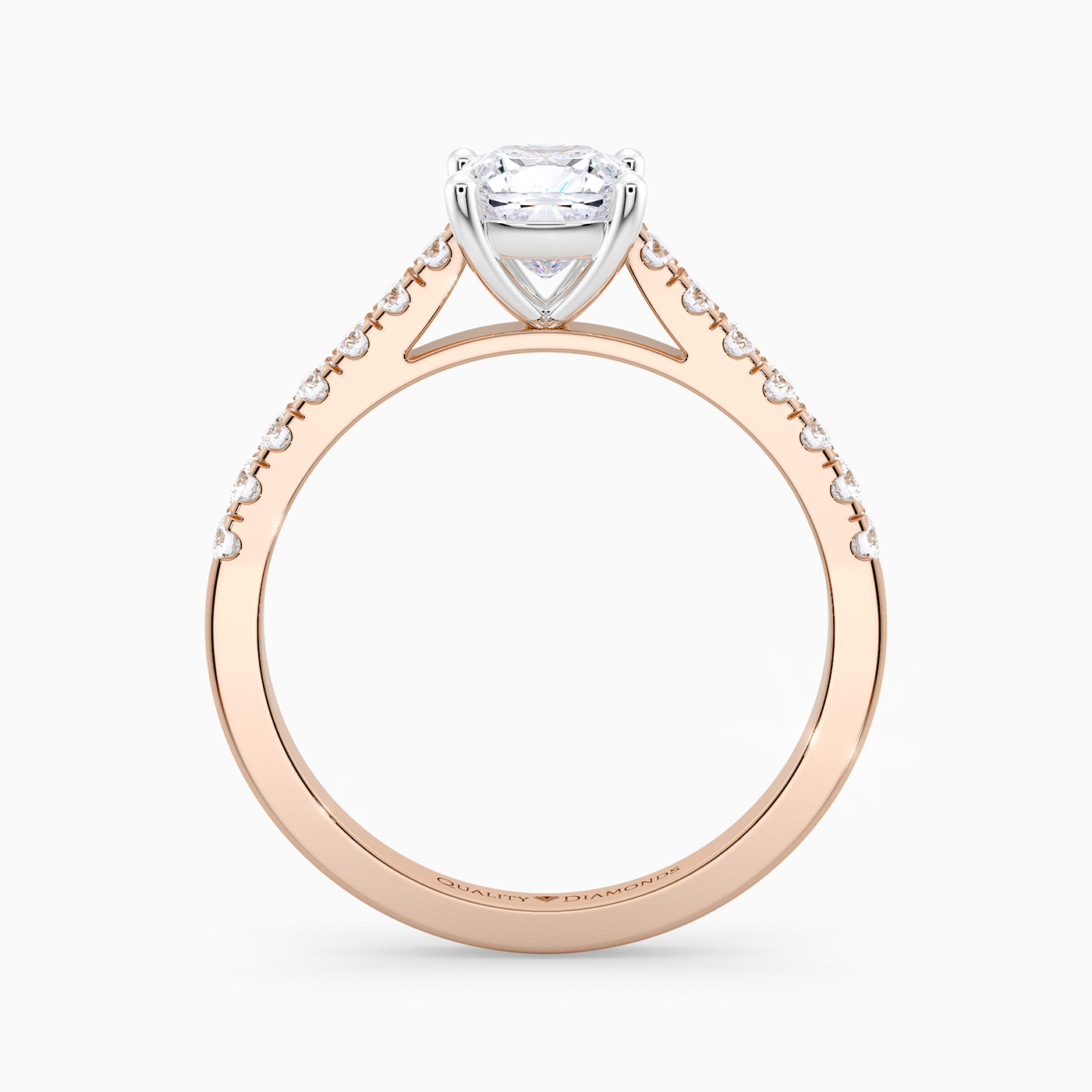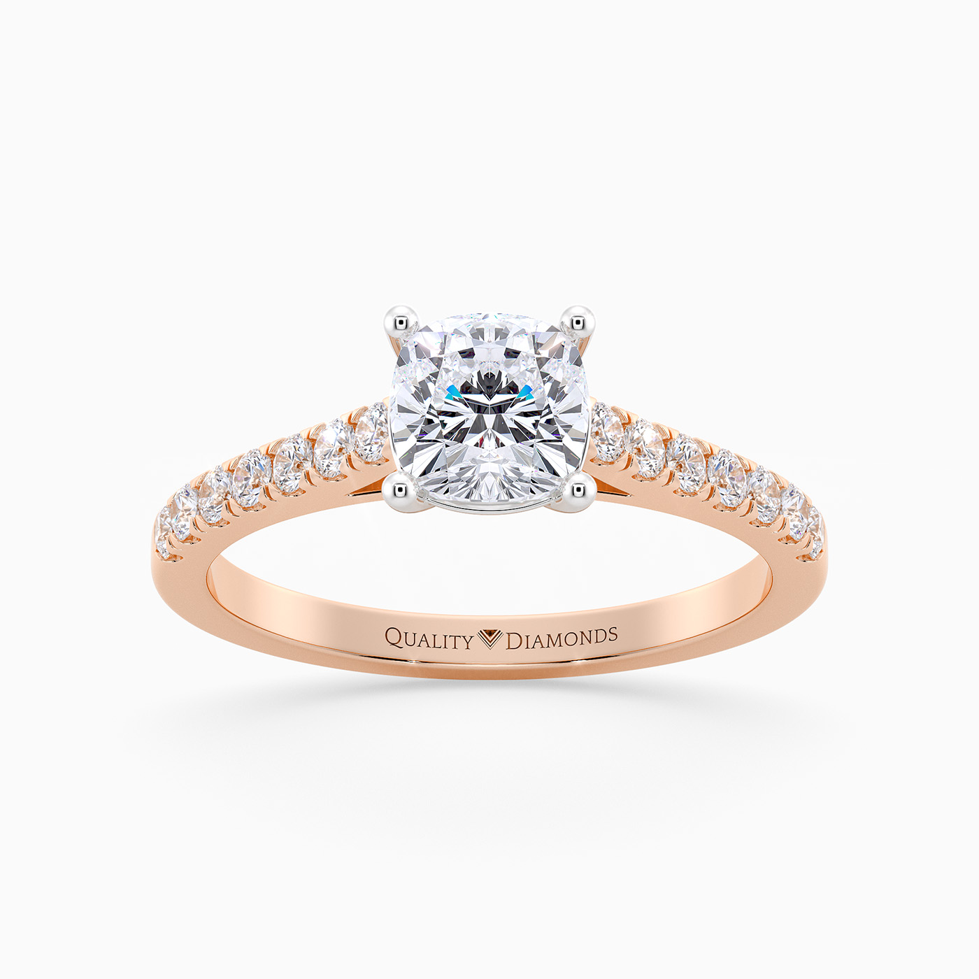 Our Classic Vintage 18K Rose Gold Milena features Four Claws securing the Cushion Cut Diamond, with open detailing at the sides to allow the light to complement the Diamond. The Round Brilliant Diamonds are set into each shoulder, creating an extra sparkly detail.