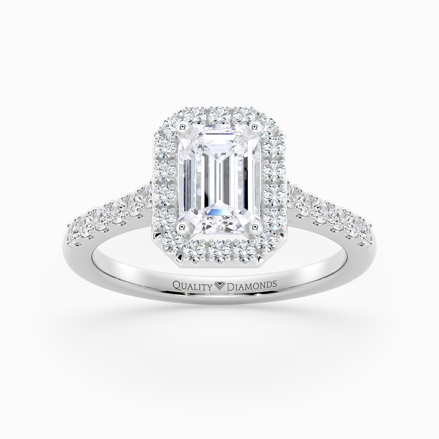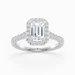 Our Emerald Cut 9K White Gold Halo Bijou holds the central diamond in a four-claw setting with surrounding brilliant round diamonds micro-pave set in the shoulders. This very sparkly Vintage Style captures the light beautifully creating a dramatic and eye-catching design.