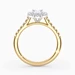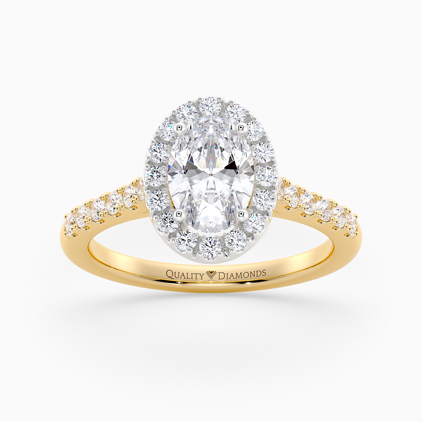 Our Oval Cut 9K Yellow Gold Halo Bijou holds the Central Diamond in a four-claw setting with surrounding brilliant round diamonds micro-pave set in the shoulders. This Sparkly Vintage Style Design captures the light beautifully, creating a dramatic and eye-catching Design.