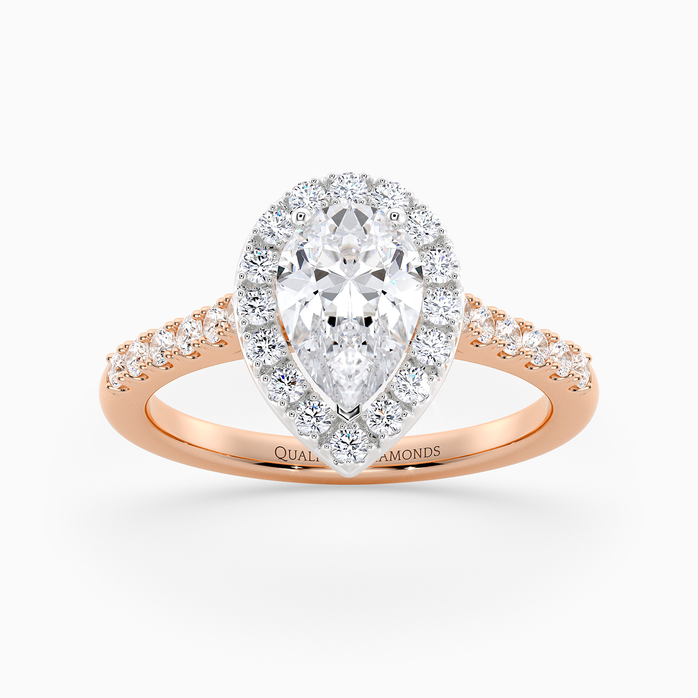 Our Pear Cut 18K Rose Gold Halo Bijou holds the central diamond in a three-claw setting with surrounding brilliant round diamonds micro-pave set in the shoulders. This Sparkly Vintage Style captures the light beautifully, creating a dramatic and eye-catching design.
