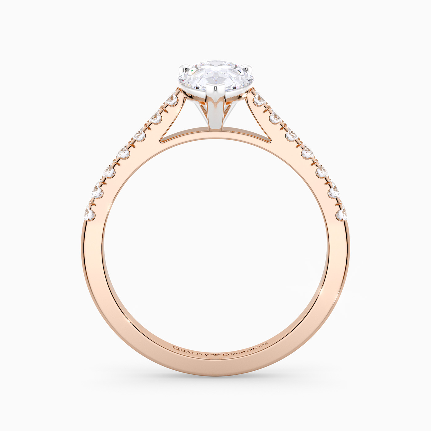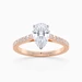 Our Classic 18K Rose Gold Vintage Milena features Four Claws securing the pear-cut diamond, with open detailing at the sides to allow the light to complement the Diamond. The Round Brilliant Diamonds are set into each shoulder creating an extra sparkly detail.