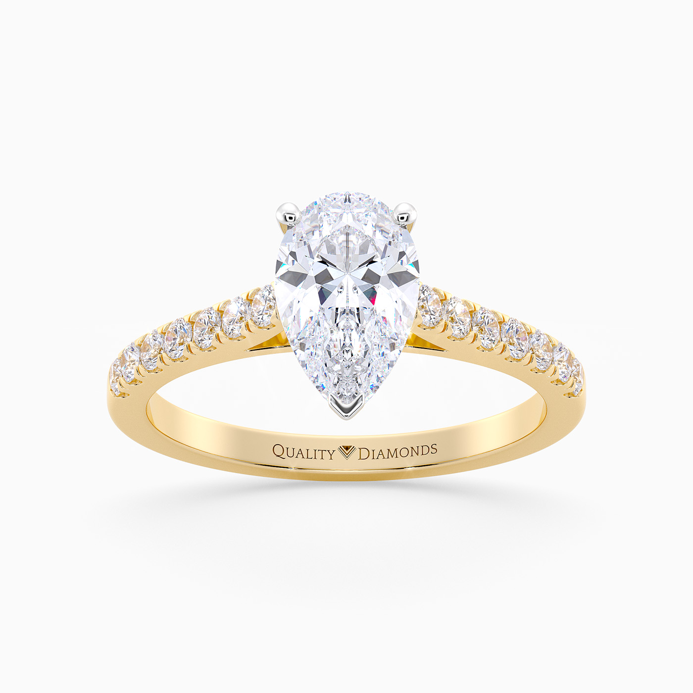 Our Classic 9K Yellow Gold Vintage Milena features Four Claws securing the pear-cut diamond, with open detailing at the sides to allow the light to complement the Diamond. The Round Brilliant Diamonds are set into each shoulder creating an extra sparkly detail.