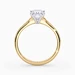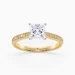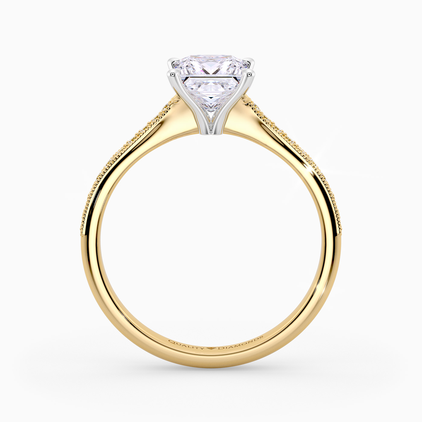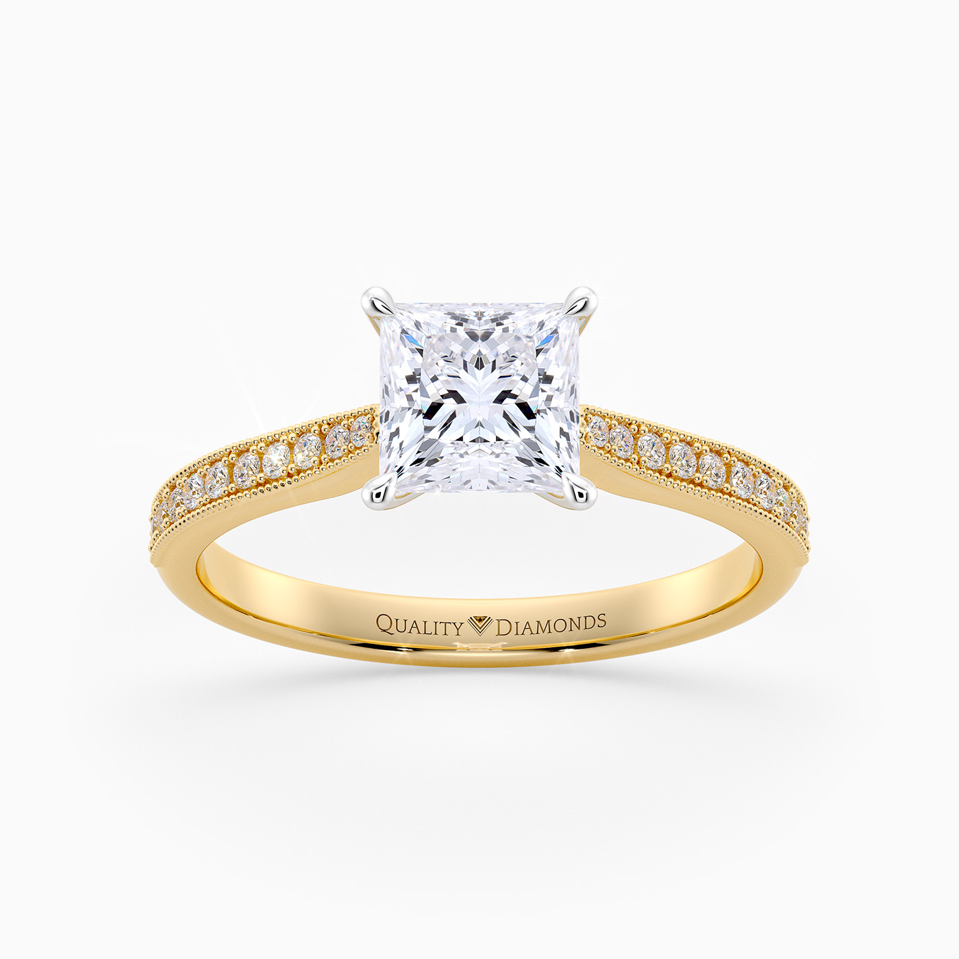 Our classic 18K Yellow Gold diamond-set solitaire Beau features four elegant claws that secure the Princess diamond, creating a V shape in the side detail to complement the sparkle. The shoulders are milgrain and grain-set with round brilliant-cut diamonds.