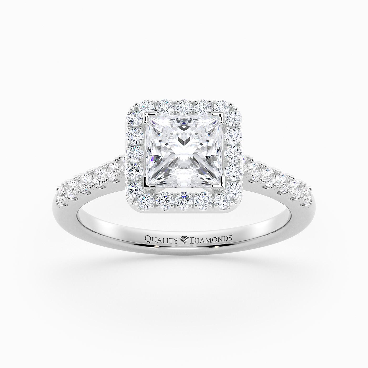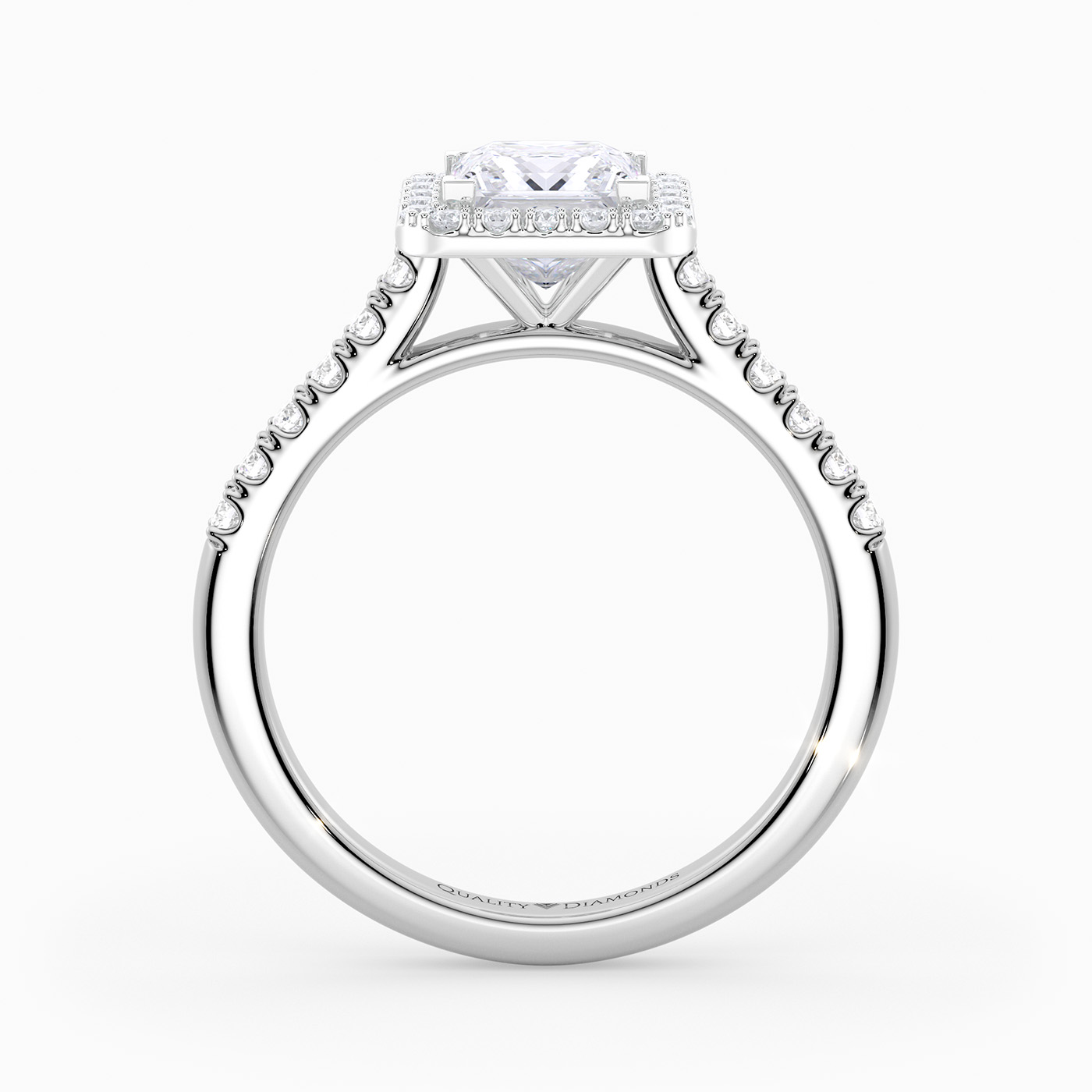 Our Princess Cut 18K White Gold Halo Bijou holds the central diamond in a four-claw setting with surrounding brilliant round diamonds micro-pave set in the shoulders. This sparkly Vintage Style captures the light beautifully creating a dramatic and eye-catching design.