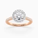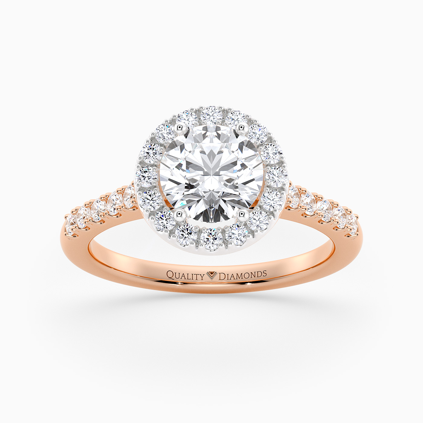 Our Round Brilliant Cut 18K Rose Gold Halo Bijou holds the Central Diamond in a four-claw setting with surrounding brilliant round diamonds micro-pave set in the shoulders. This Sparkly Vintage Style Design captures the light beautifully, creating a dramatic and eye-catching Design.