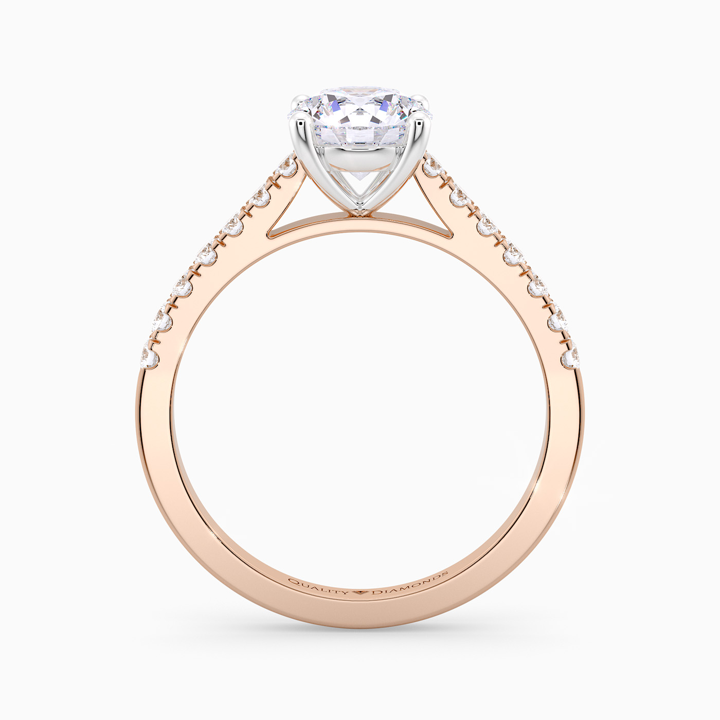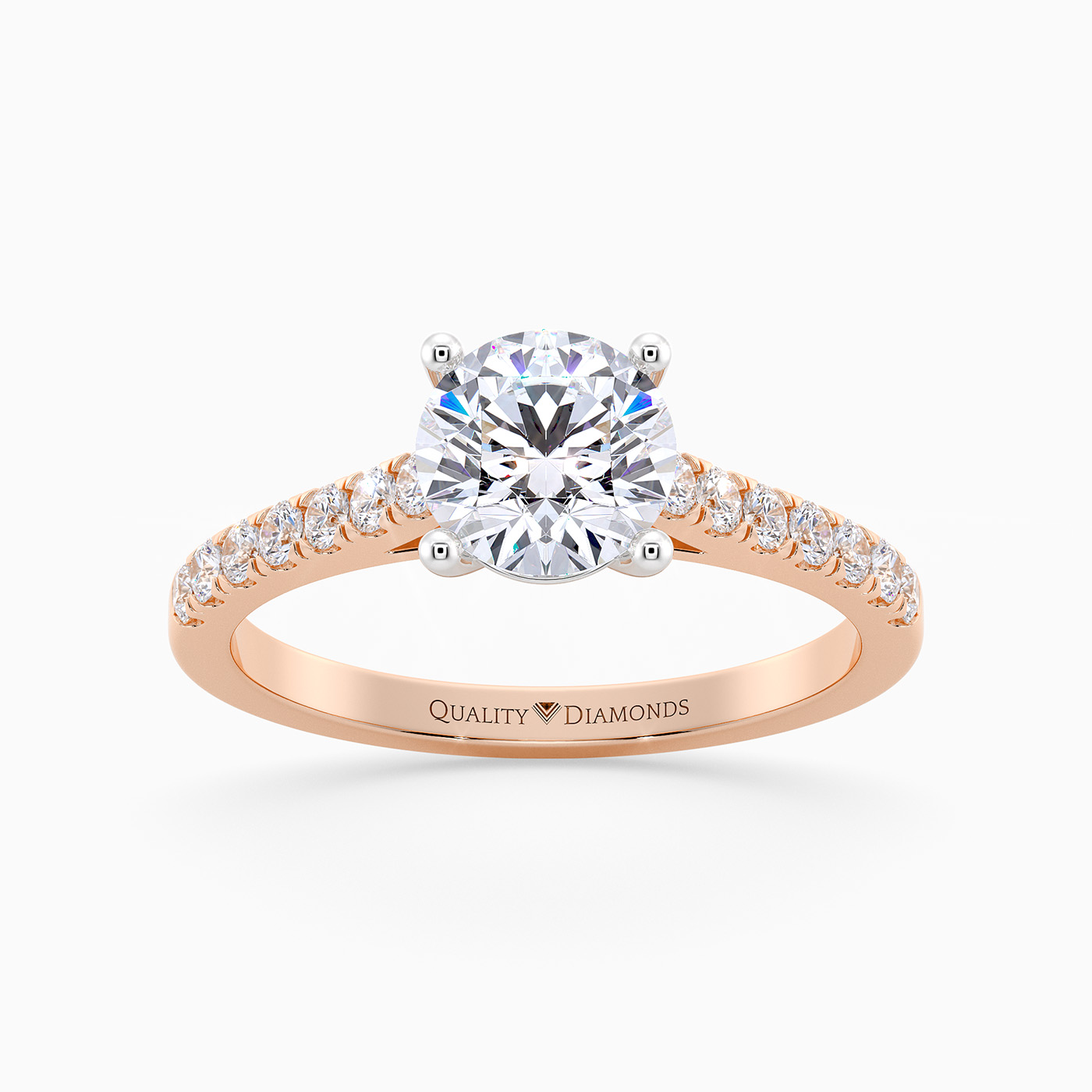Our Classic 18K Rose Gold Vintage Milena features Four Claws securing the Round Brilliant Diamond, with open detailing at the sides to allow the light to complement the Diamond. The Round Brilliant Diamonds are set into each shoulder creating an extra sparkly detail.