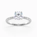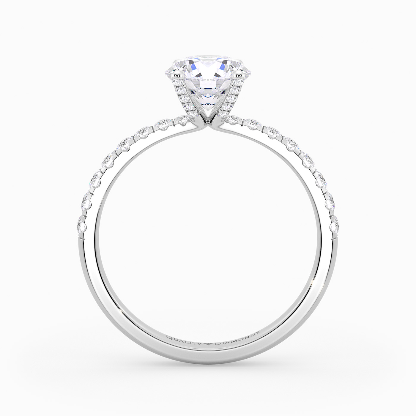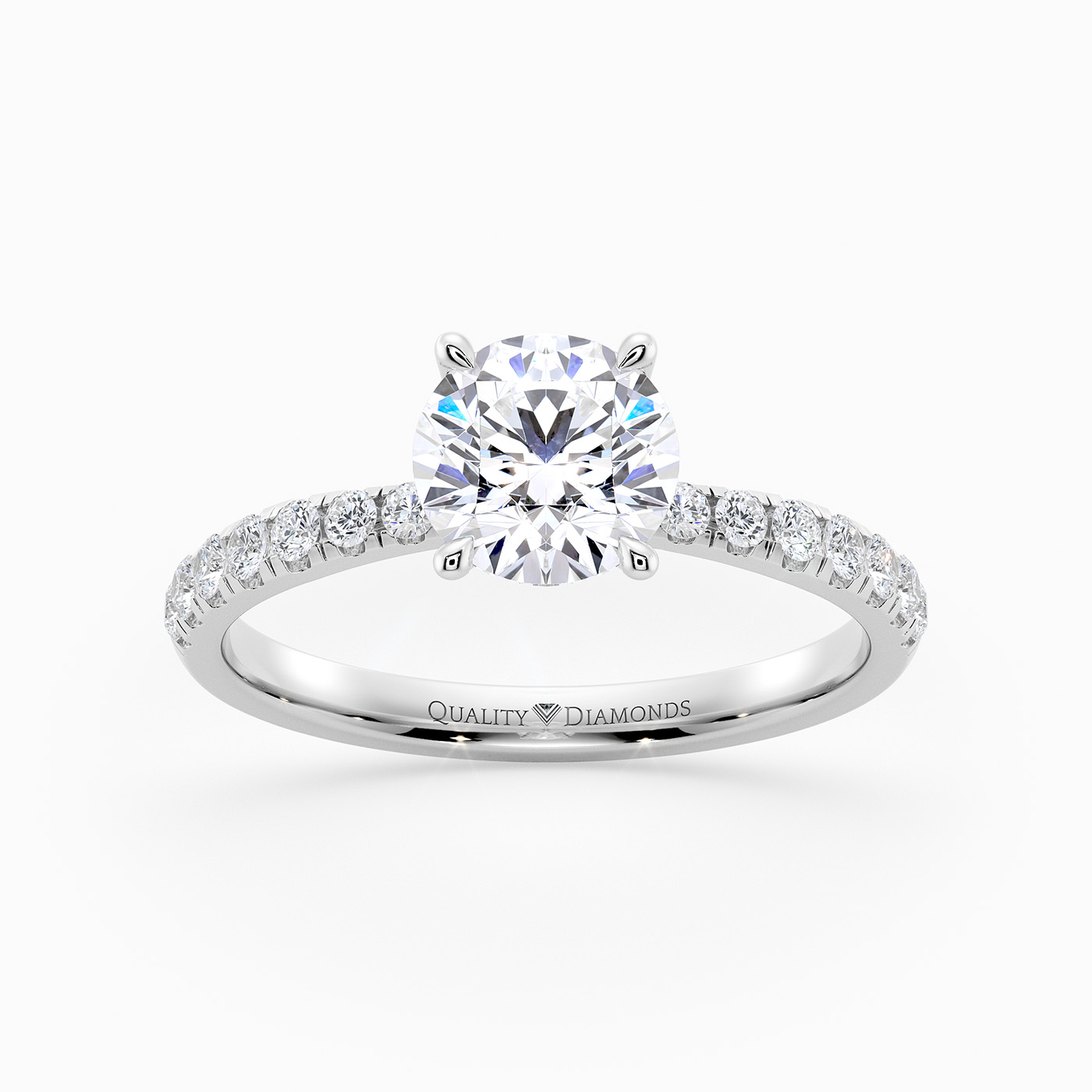 Our classic Palladium diamond-set solitaire Mirabelle proudly holds the Round Brilliant diamond in a pavé-set four-claw diamond-accented gallery setting. Round brilliant diamonds are pavé-set into the shoulders, creating extra sparkly detail.
