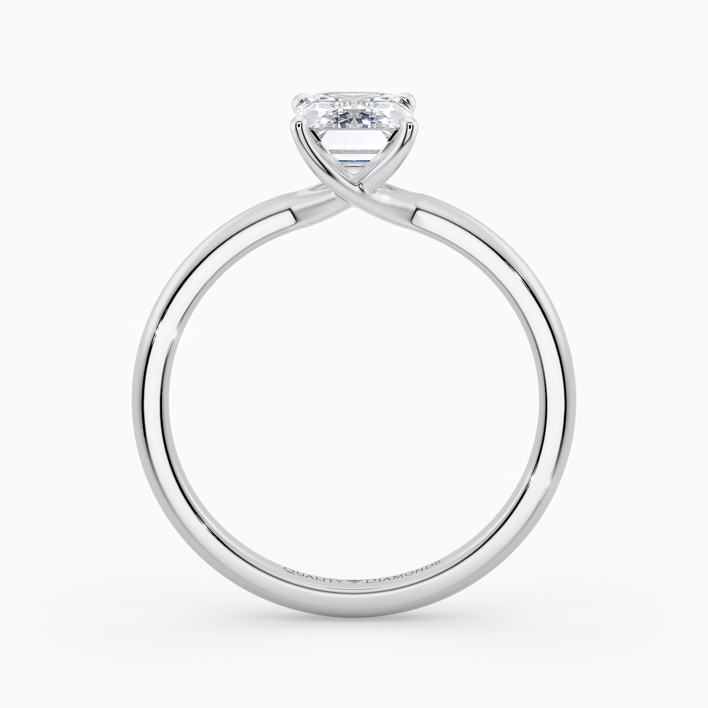 Our 9K White Gold solitaire Abbraccio holds the Emerald diamond proudly in a flowing twist four-claw setting. The delicate prongs are positioned to maximise light passing through the diamond and produce the most exquisite sparkle.