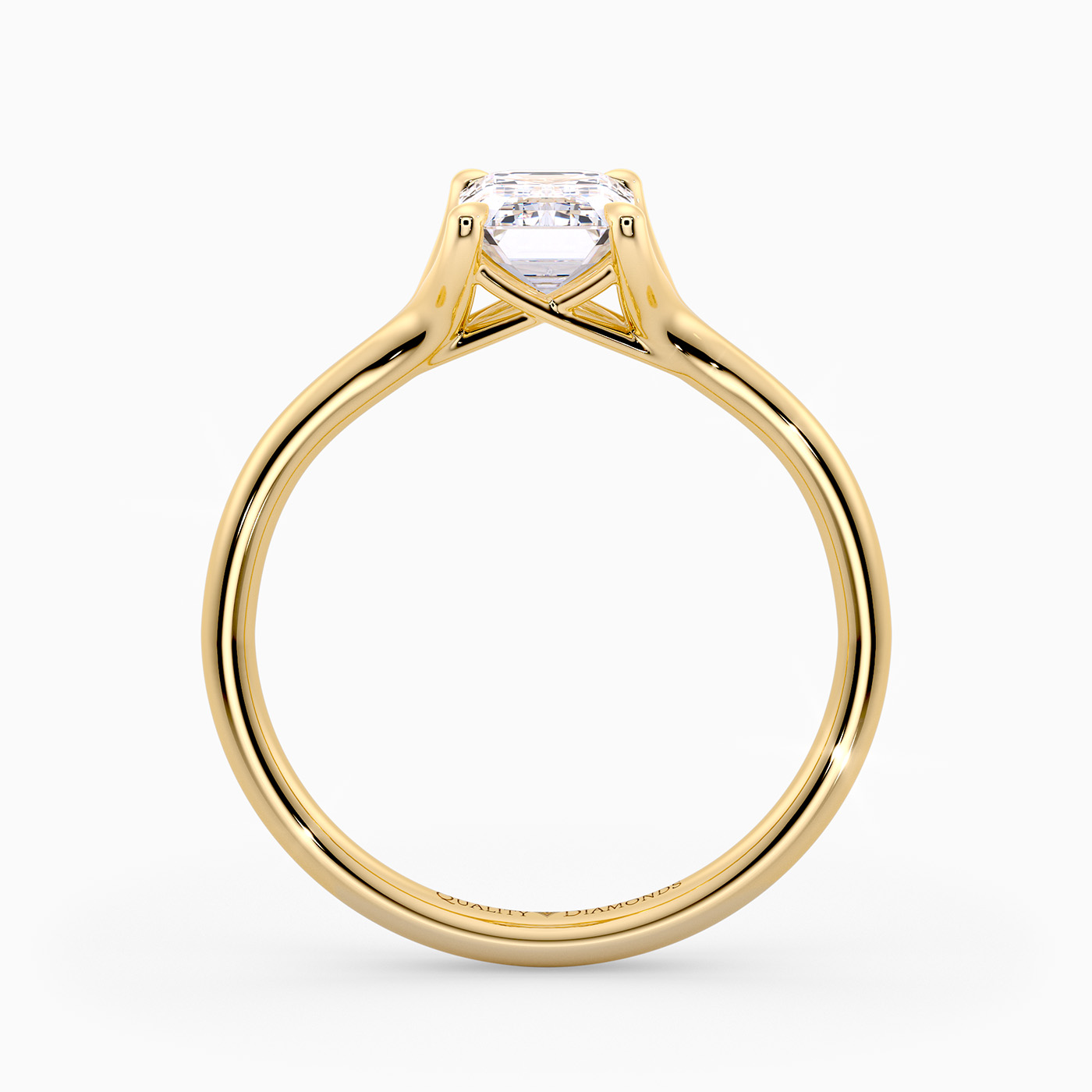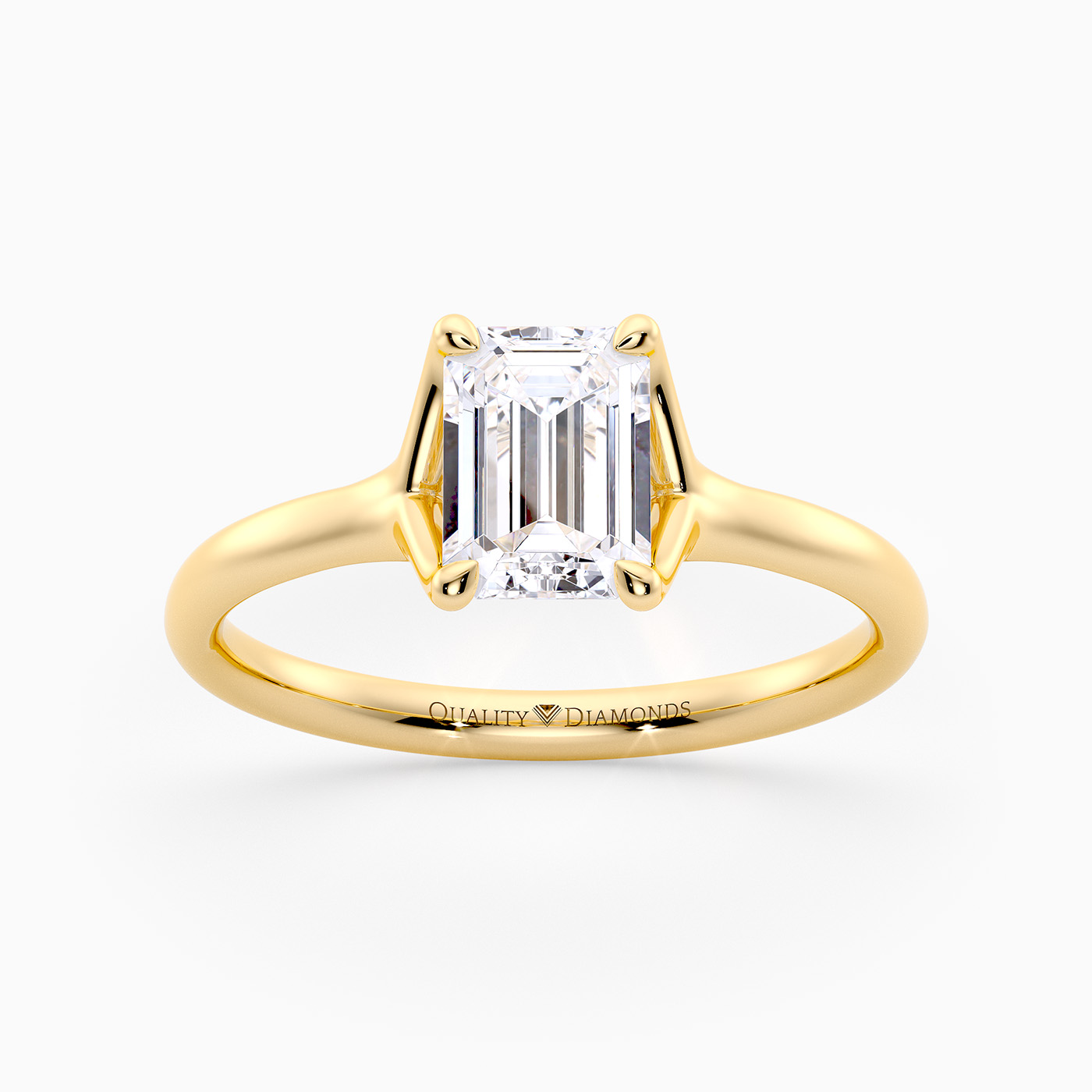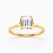 Our elegant 18K Yellow Gold solitaire Aurelia holds the Emerald diamond in a delicate, sweeping four-claw split setting, allowing light to enter from multiple angles for enhanced sparkle. The open basket beneath the diamond includes subtle structural supports, adding both stability and an airy elegance to the overall design.