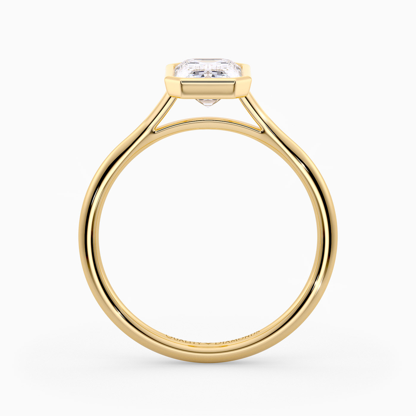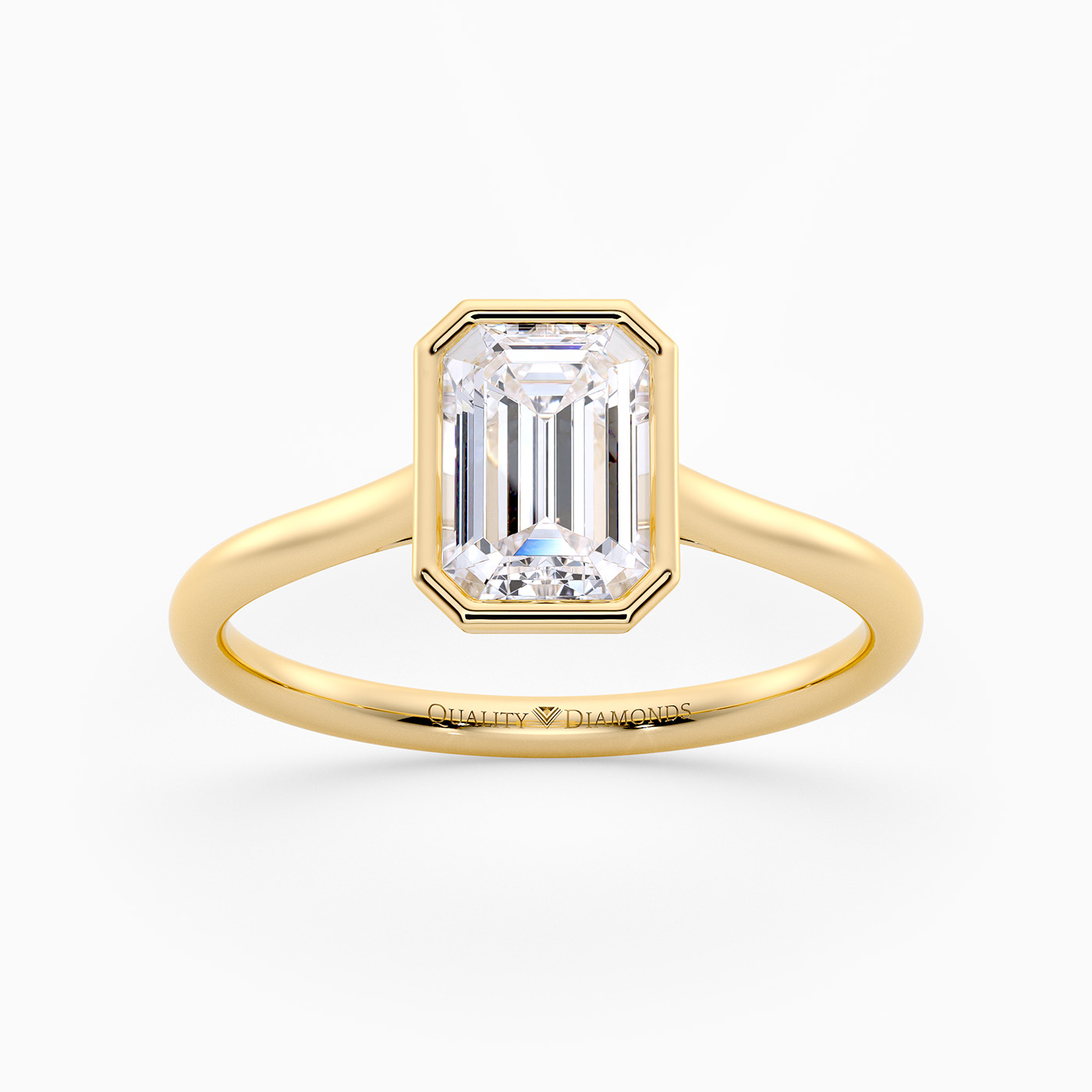 Our contemporary 9K Yellow Gold solitaire Carina holds the Emerald diamond in a modern bezel setting, complementing the elegant design. The rounded band finishes off the contemporary design beautifully.