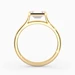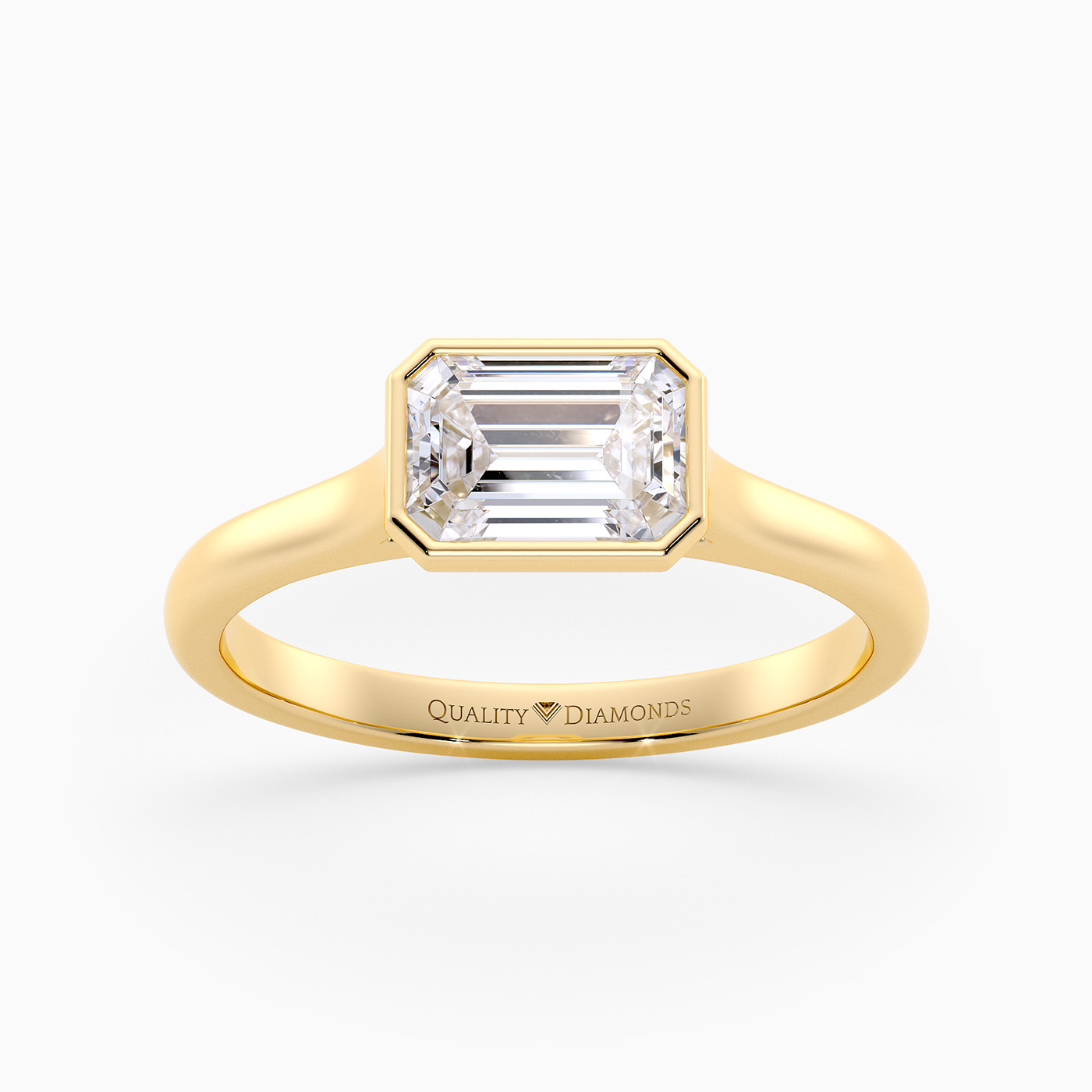 Our modern 18K Yellow Gold solitaire East-West Carina holds the Emerald diamond in a sleek, full-bezel horizontal tension setting. The design is elevated by a cathedral-style bridge, lifting the setting above a delicate, rounded band to create an architectural, airy aesthetic that feels both contemporary and timeless.
