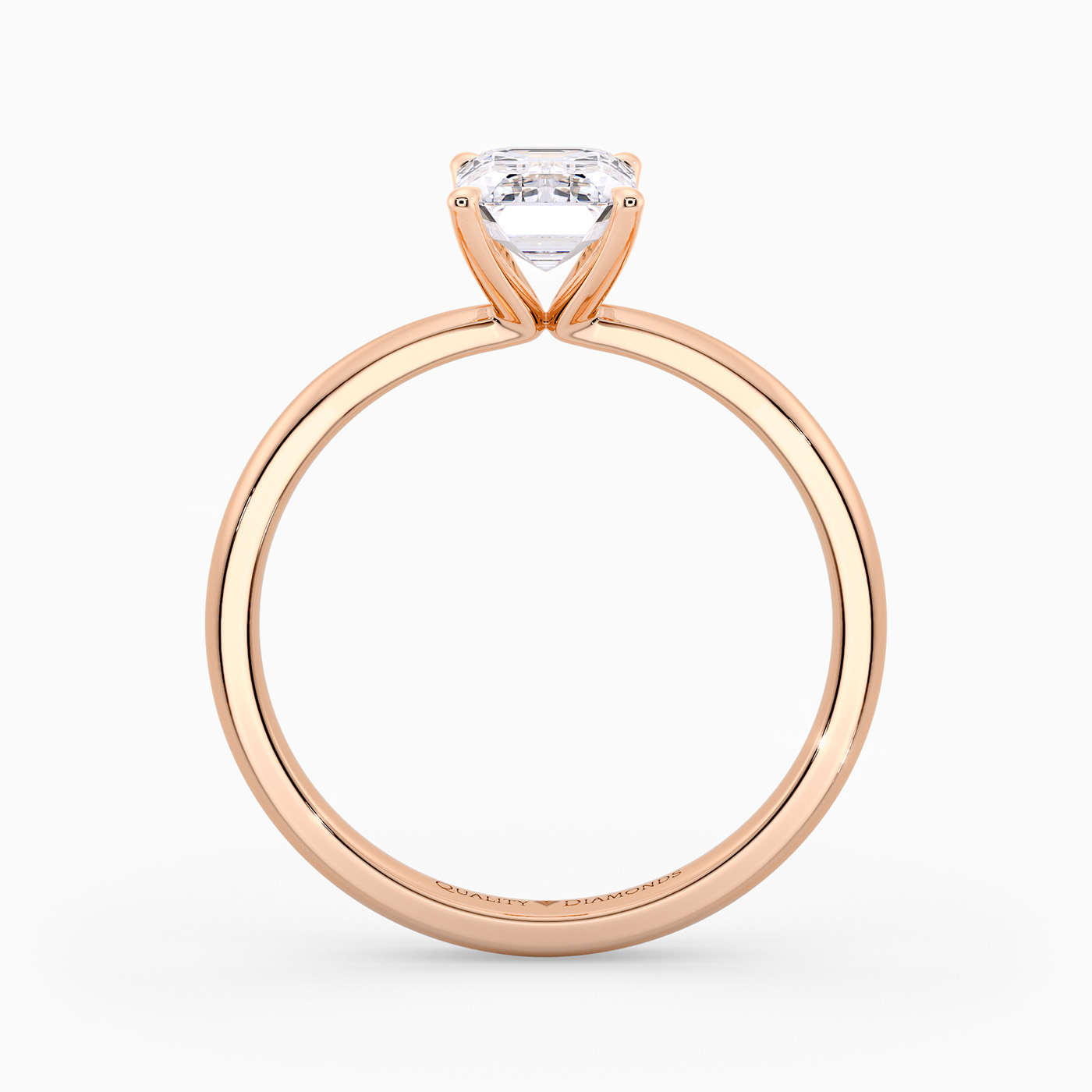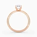 Our classic 9K Rose Gold solitaire Mirabelle holds the Emerald diamond in an elegant V-shaped four-claw setting, securely cradling the diamond while allowing plenty of light to enter from the sides. The elevated, open setting enhances the stone's brilliance and creates a timeless, sophisticated look with simple, flowing lines.