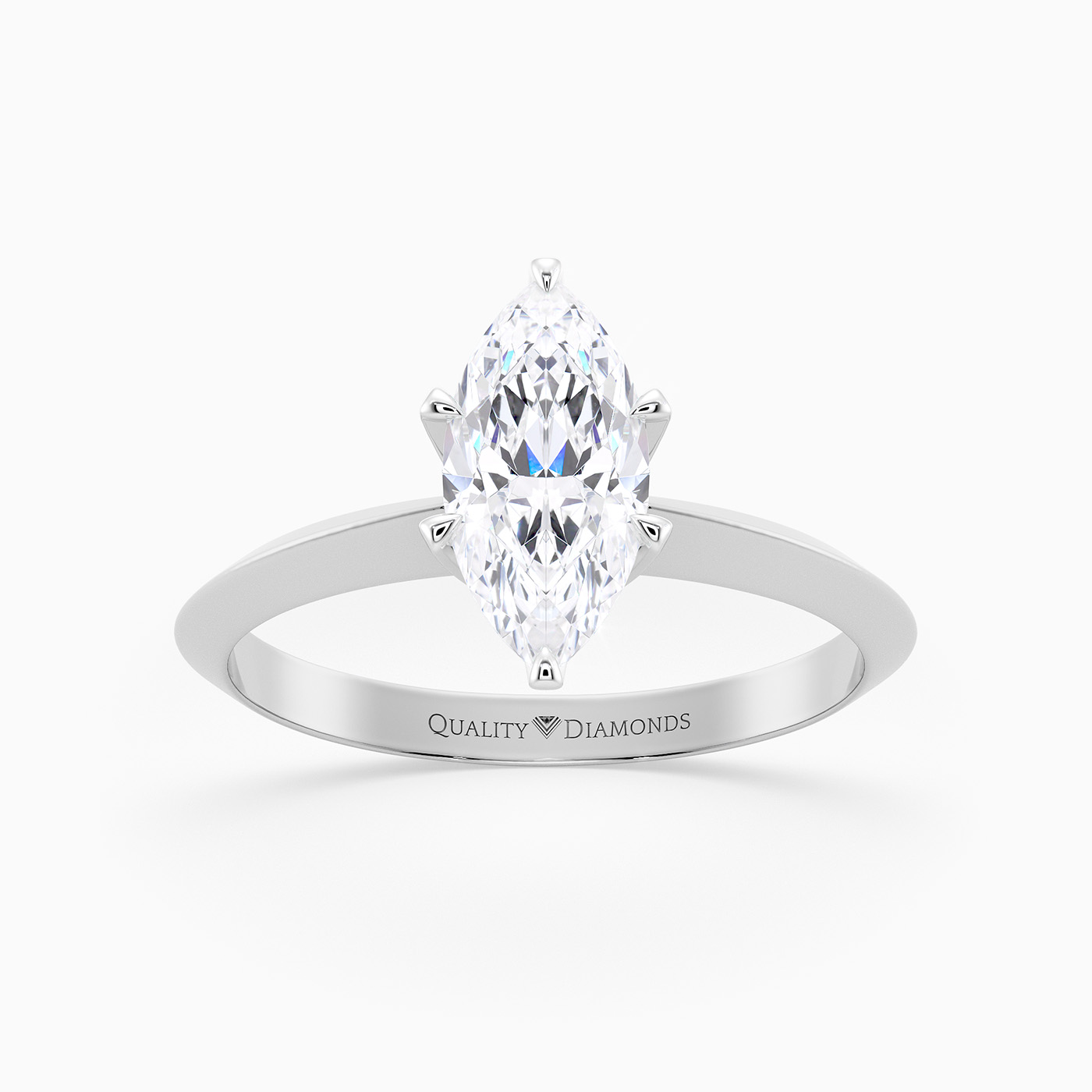 Our classic Platinum solitaire Carella holds the Marquise diamond proudly in a secure six-claw setting, to complement the sparkle. The shoulders taper to a knife-edge, elevating the diamond to fully display its dramatic beauty.