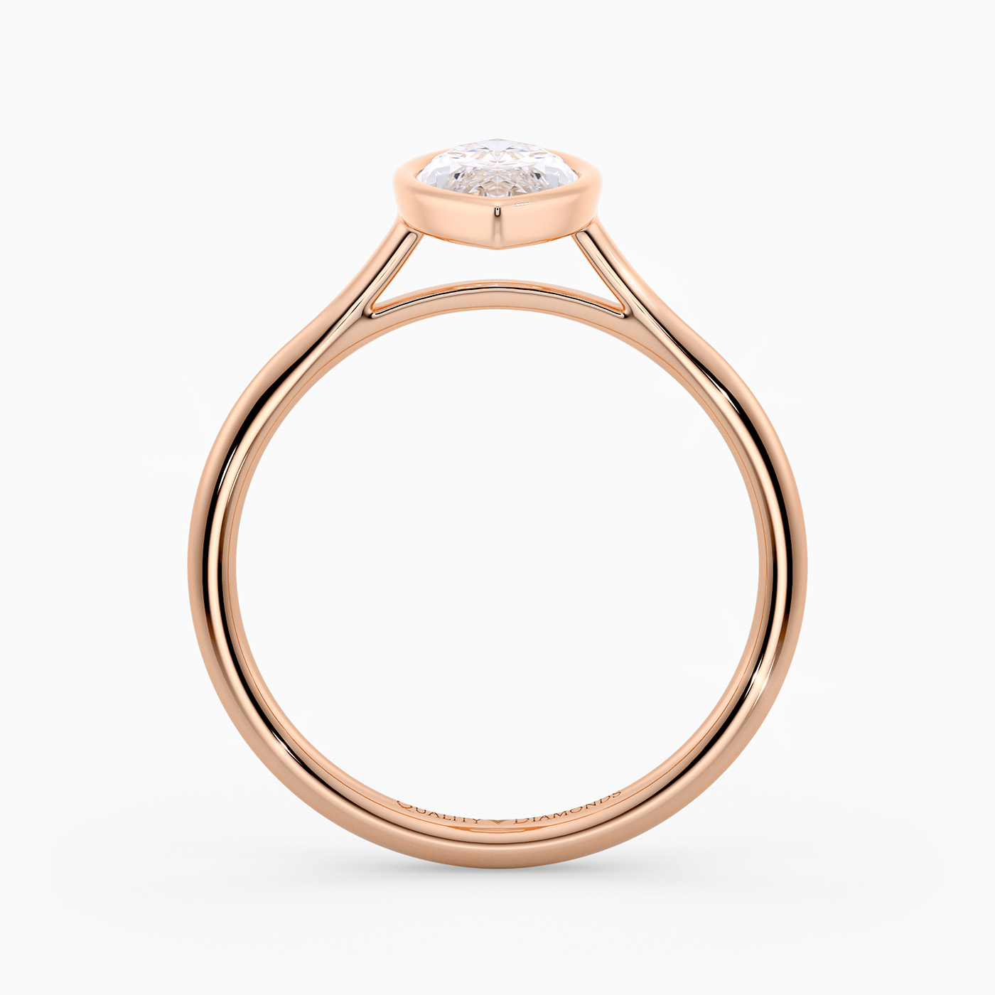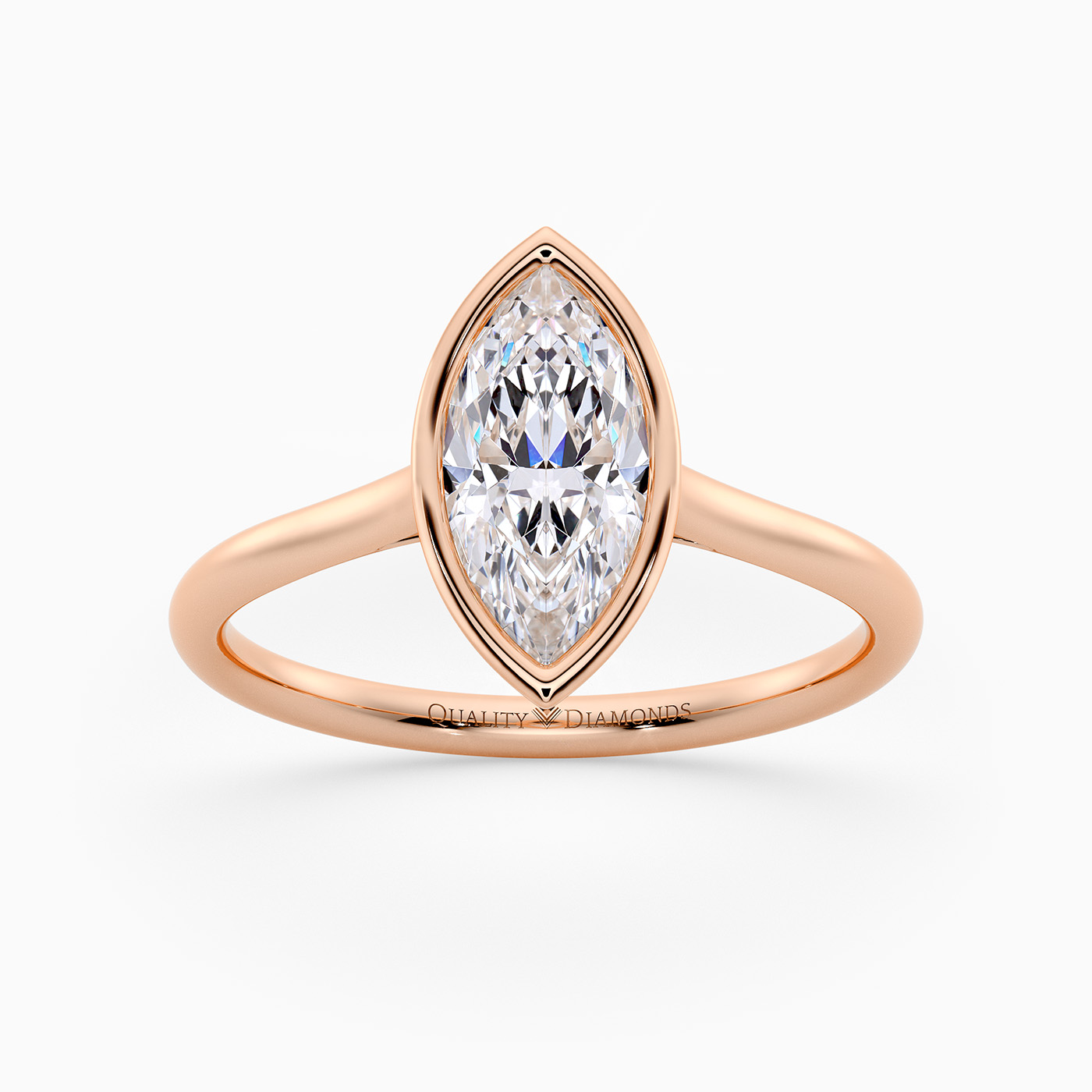 Our contemporary 18K Rose Gold solitaire Carina holds the Marquise diamond in a modern bezel setting, complementing the elegant design. The rounded band finishes off the contemporary design beautifully.