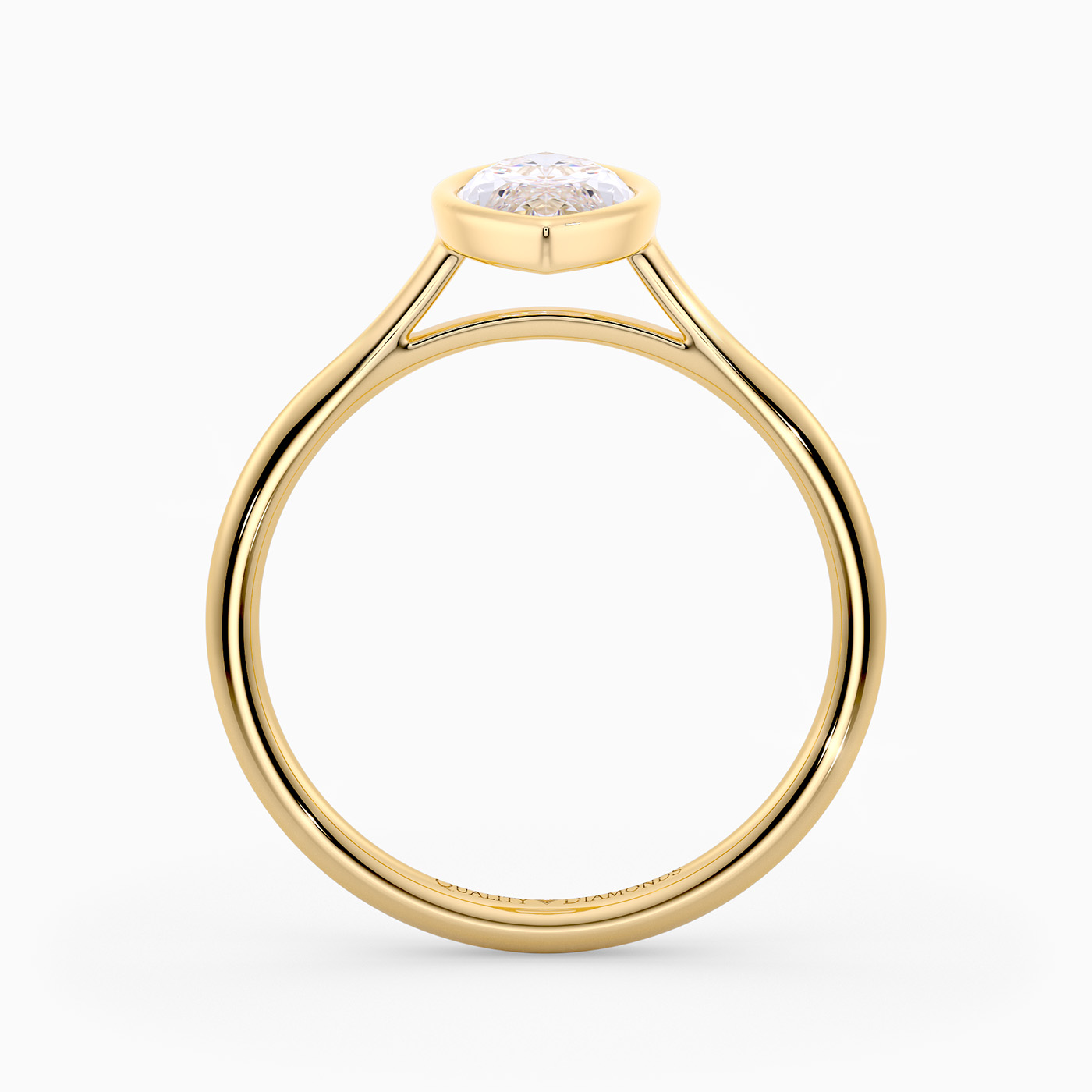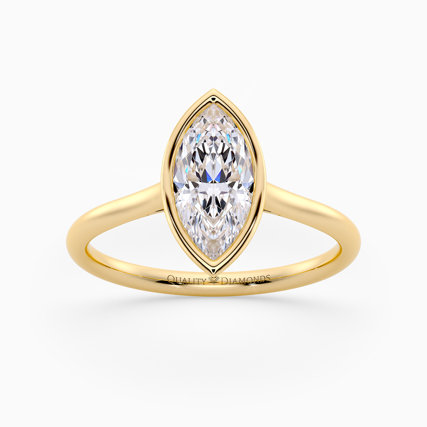 Our contemporary 9K Yellow Gold solitaire Carina holds the Marquise diamond in a modern bezel setting, complementing the elegant design. The rounded band finishes off the contemporary design beautifully.