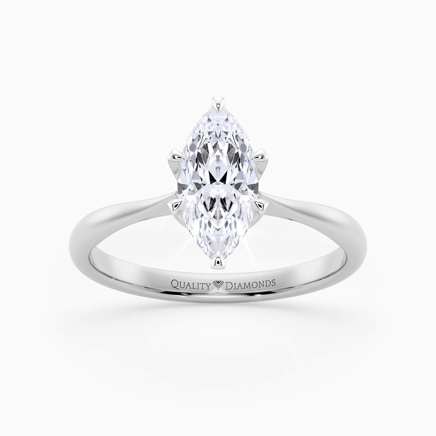 Our classic Platinum solitaire Bellezza holds the Marquise diamond proudly in a delicate six-claw setting, maximising the amount of light passing through the stone. The classic court-shaped band sweeps up to tapered shoulders, complementing this elegant design.