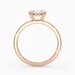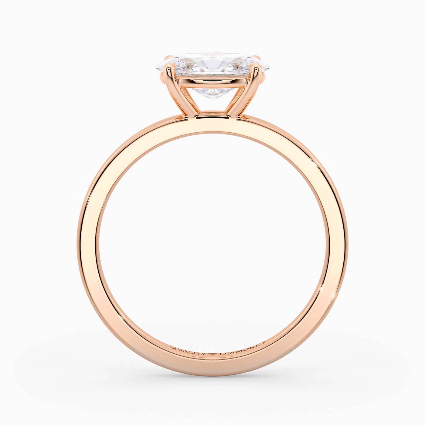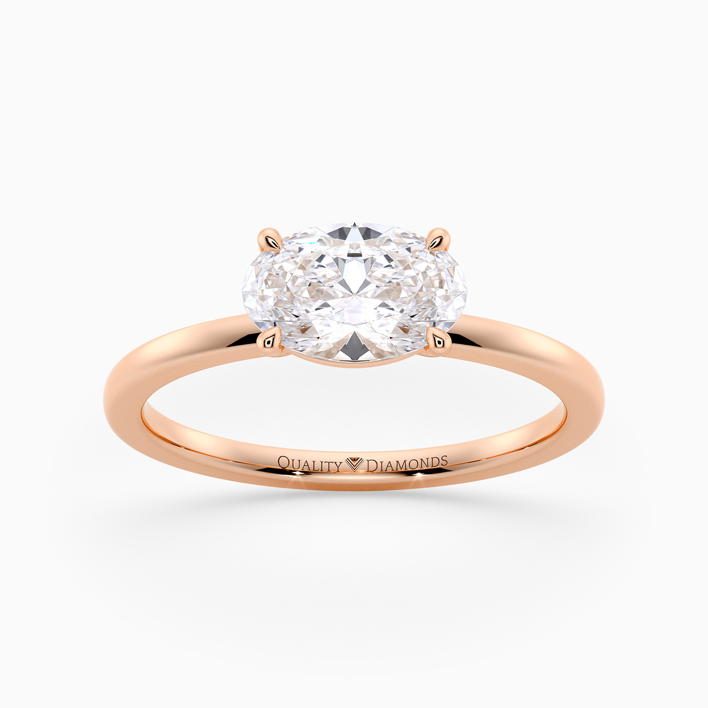 This elegant Oval east-west style 9K Rose Gold Amada four-claw solitaire ring features a raised gallery that allows any wedding band to sit flush for a perfect fit.