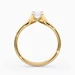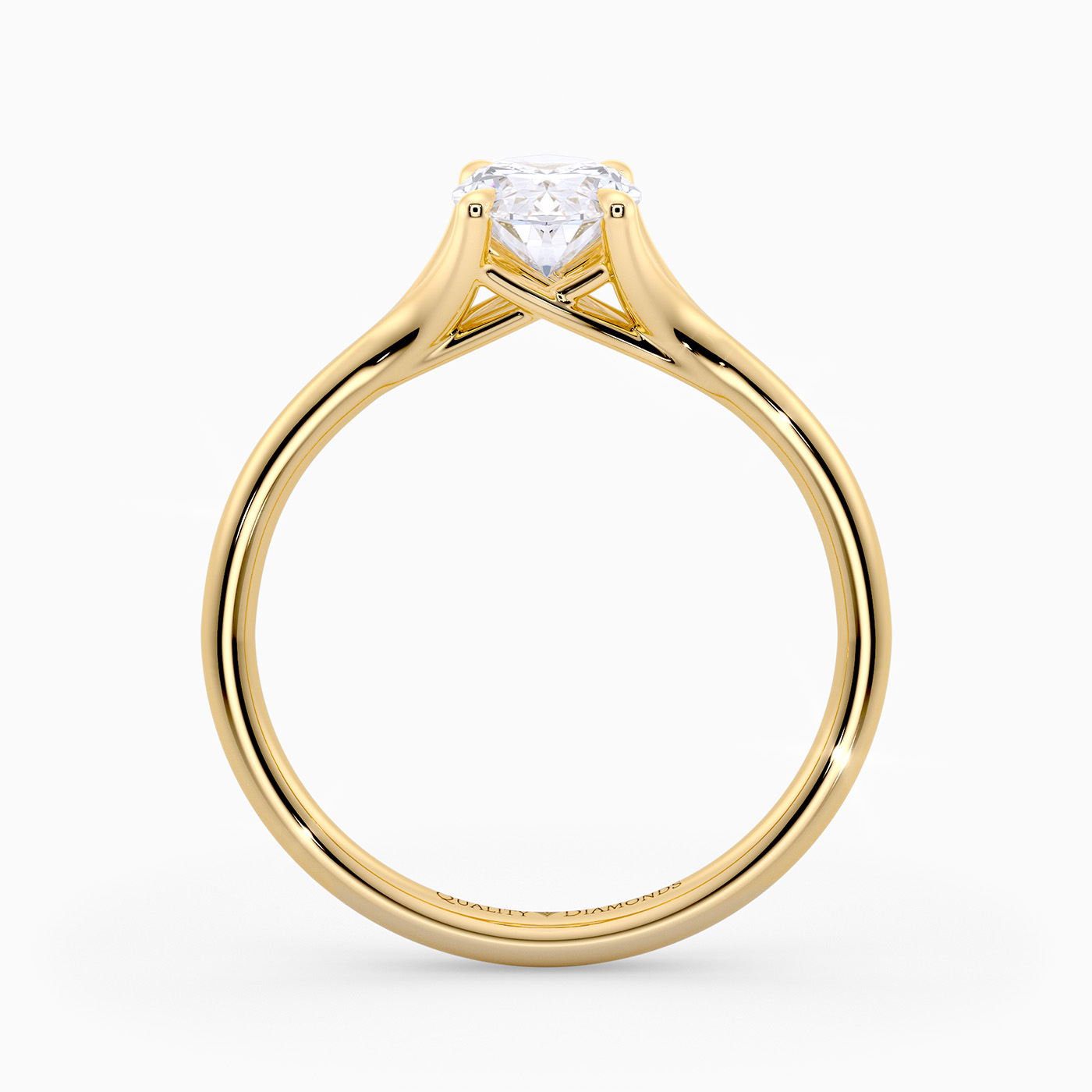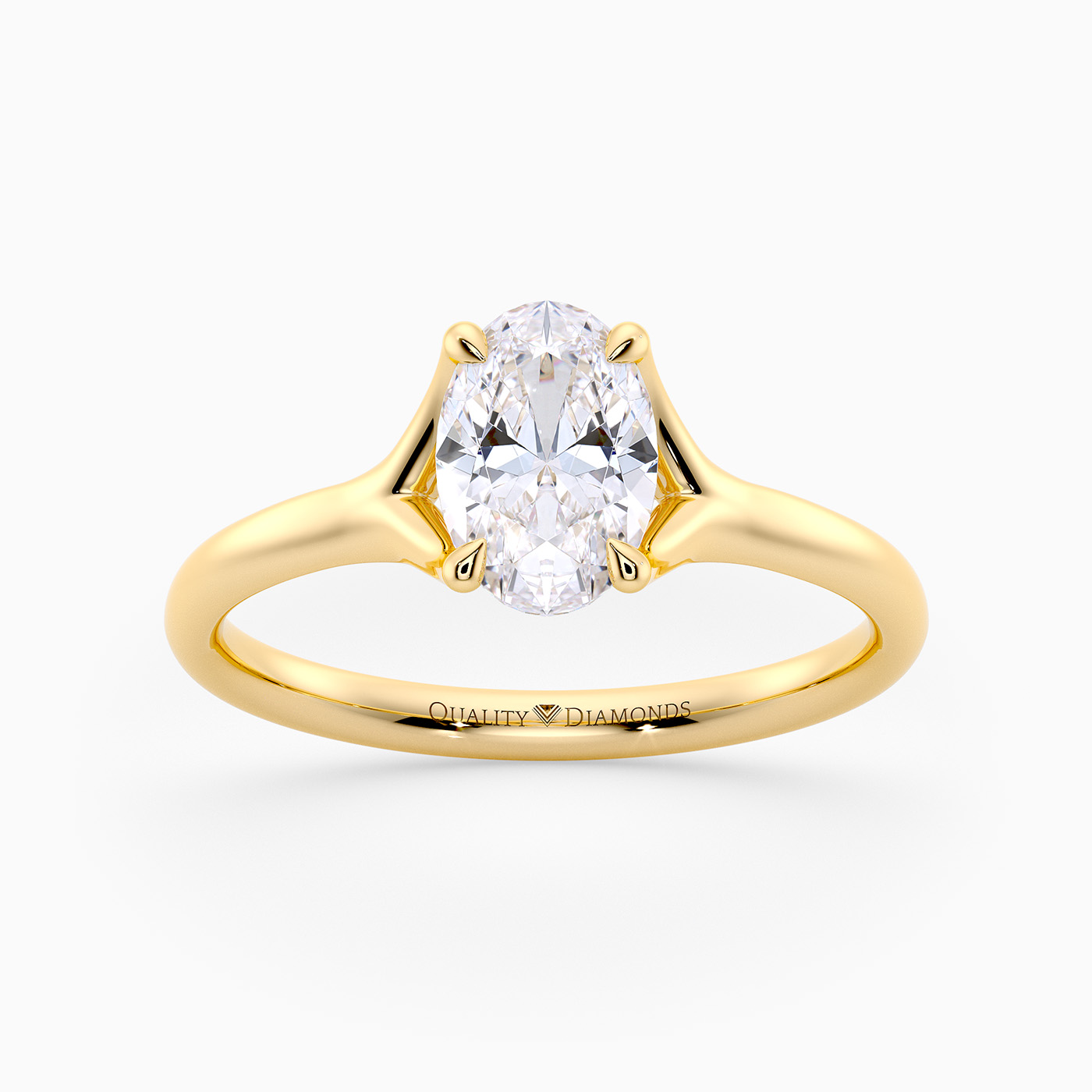 Our elegant 9K Yellow Gold solitaire Aurelia holds the Oval diamond in a delicate, sweeping four-claw split setting, allowing light to enter from multiple angles for enhanced sparkle. The open basket beneath the diamond includes subtle structural supports, adding both stability and an airy elegance to the overall design.