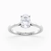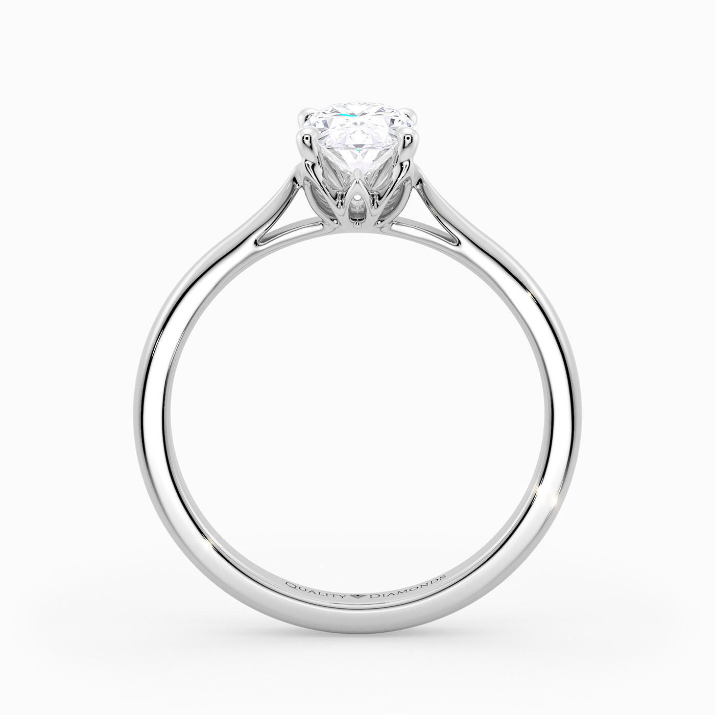 Our classic Palladium solitaire Flor features a delicate, sculpted, floral four-claw setting for the Oval diamond. The classic court-shaped band splits and gently tapers, drawing attention to the diamond.