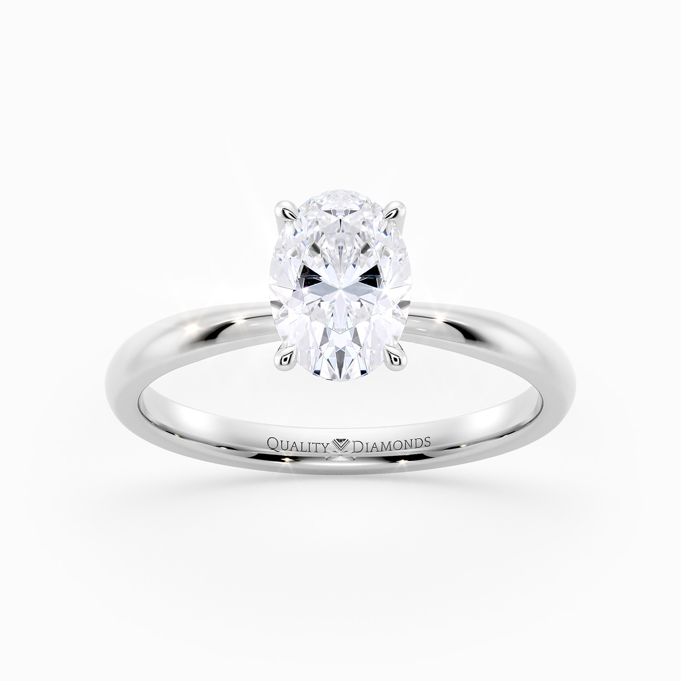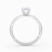 Our classic Palladium solitaire Mirabelle holds the Oval diamond in an elegant V-shaped four-claw setting, securely cradling the diamond while allowing plenty of light to enter from the sides. The elevated, open setting enhances the stone's brilliance and creates a timeless, sophisticated look with simple, flowing lines.