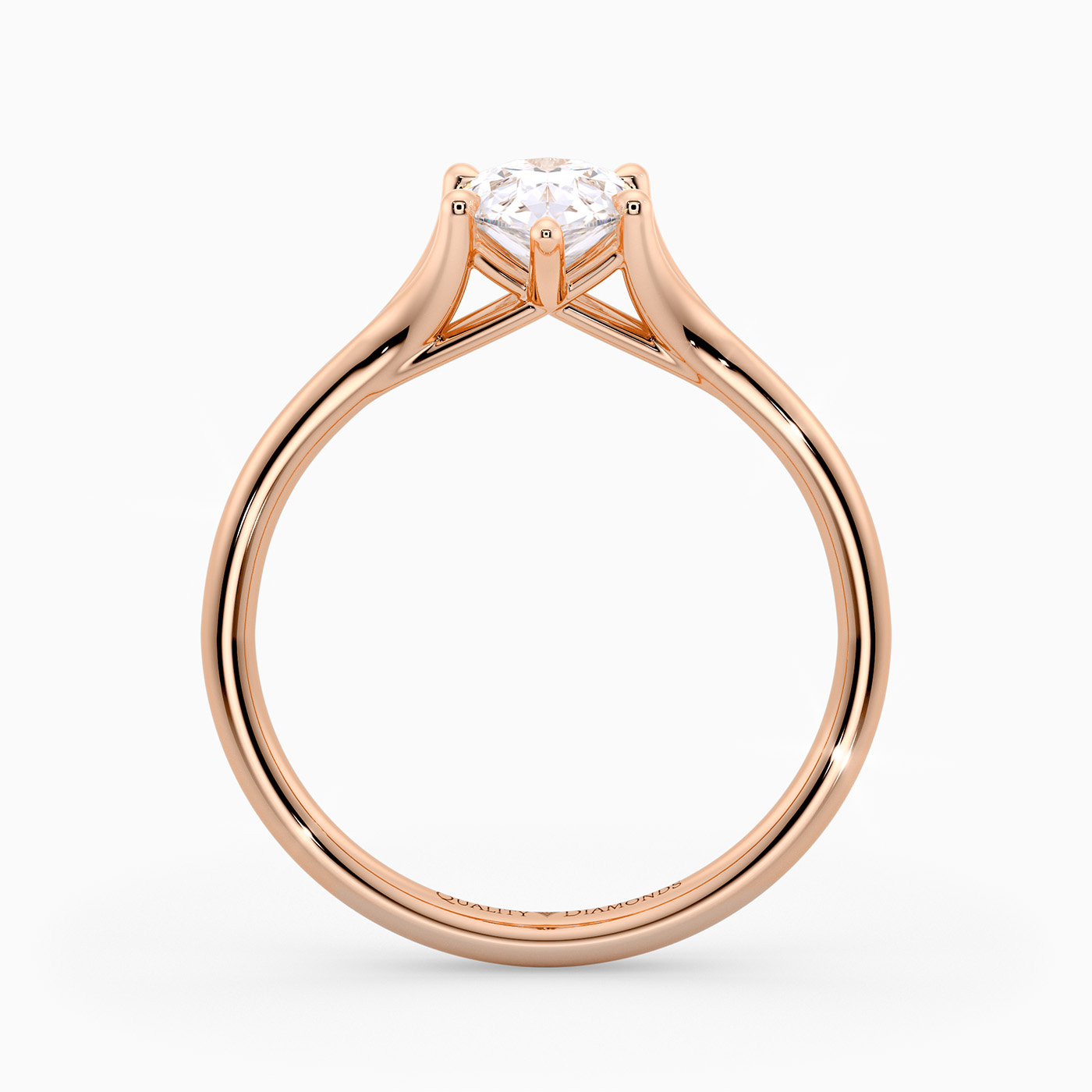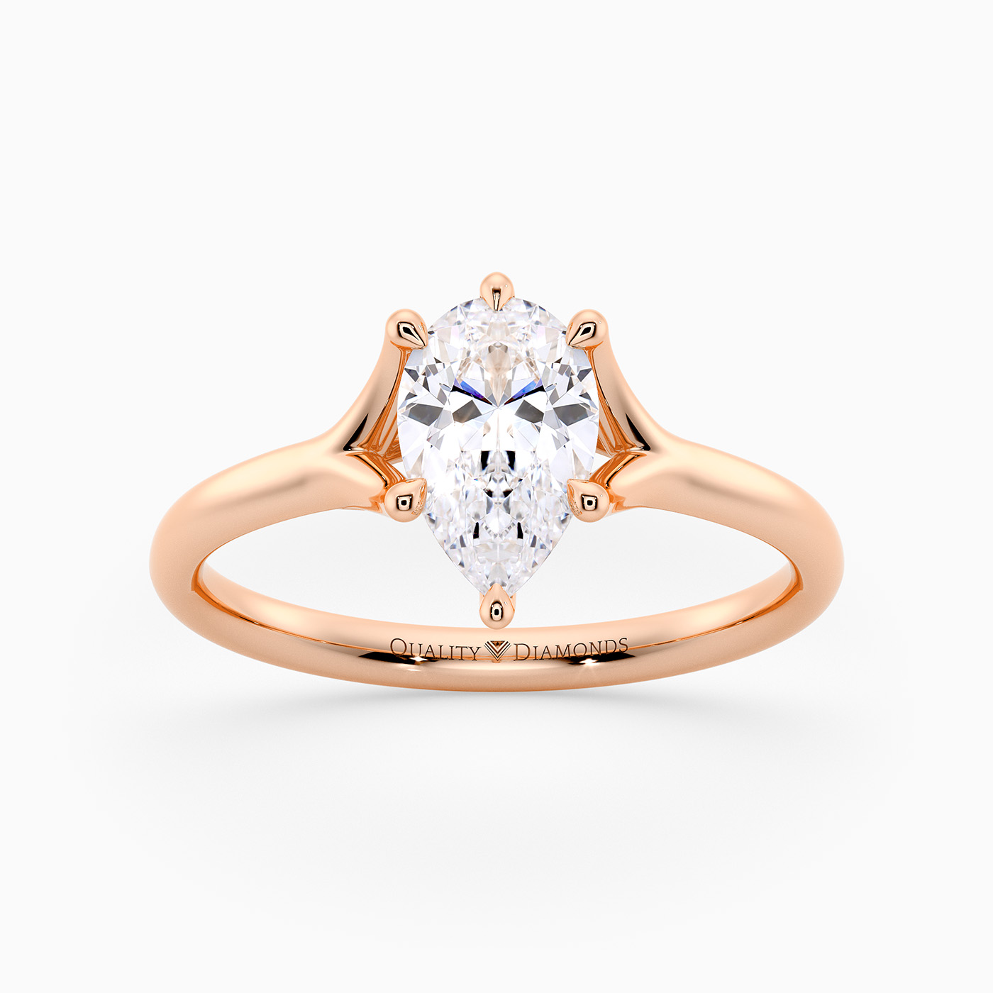 Our elegant 18K Rose Gold solitaire Aurelia holds the Pear diamond in a delicate six-claw split setting, allowing light to enter from multiple angles for enhanced sparkle. The open basket beneath the diamond includes subtle structural supports, adding both stability and an airy elegance to the overall design.