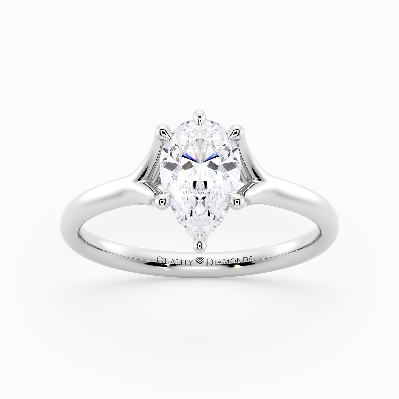 was Our Pear Cut 9K White Gold Solitaire Aurelia sweeps elegantly from a split band into three delicate Claws to hold the Diamond Securely. The Simplicity of this design creates a dramatic effect