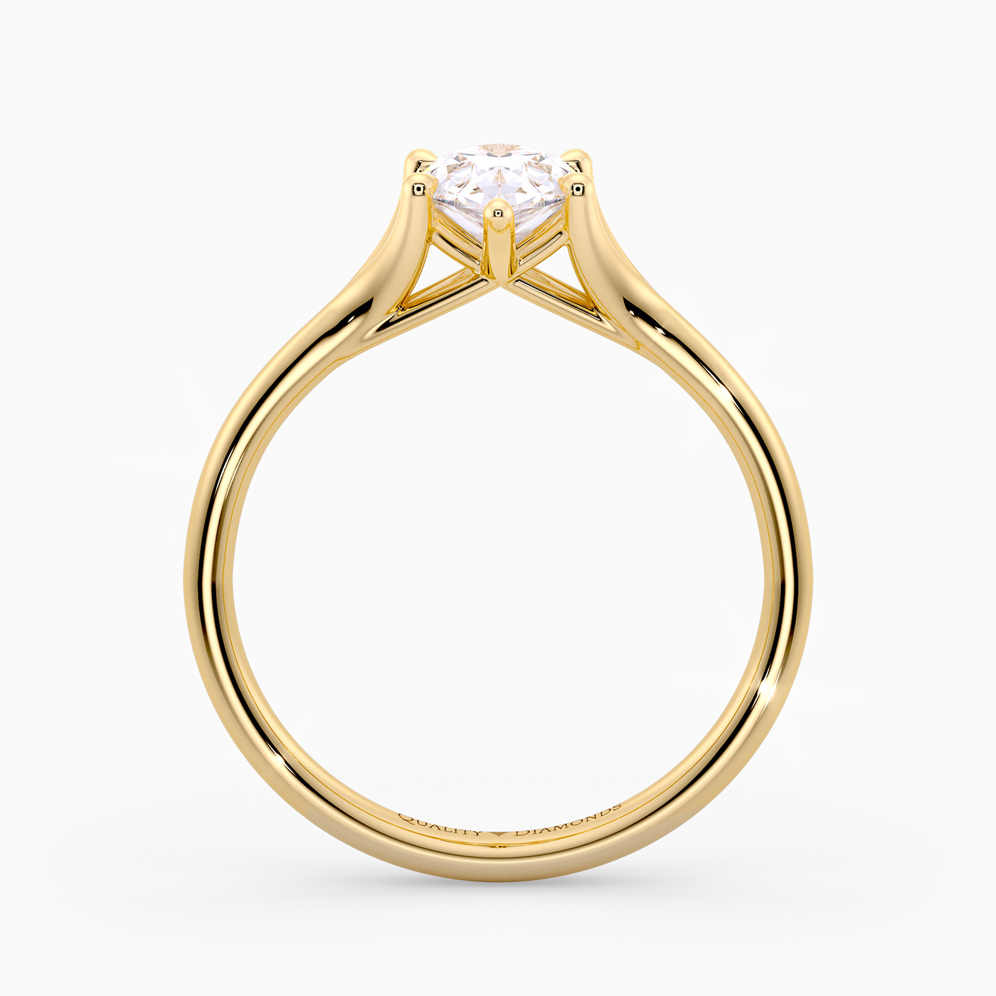 Our elegant 18K Yellow Gold solitaire Aurelia holds the Pear diamond in a delicate six-claw split setting, allowing light to enter from multiple angles for enhanced sparkle. The open basket beneath the diamond includes subtle structural supports, adding both stability and an airy elegance to the overall design.