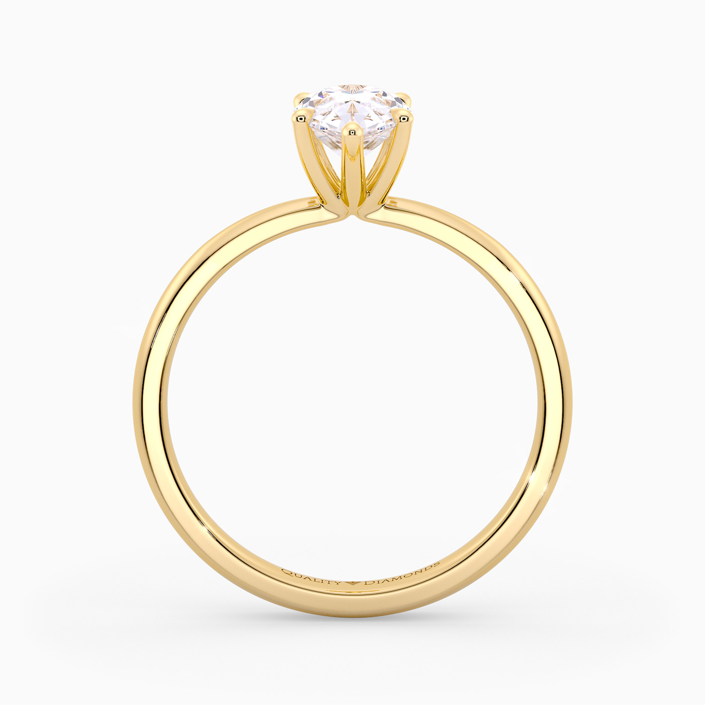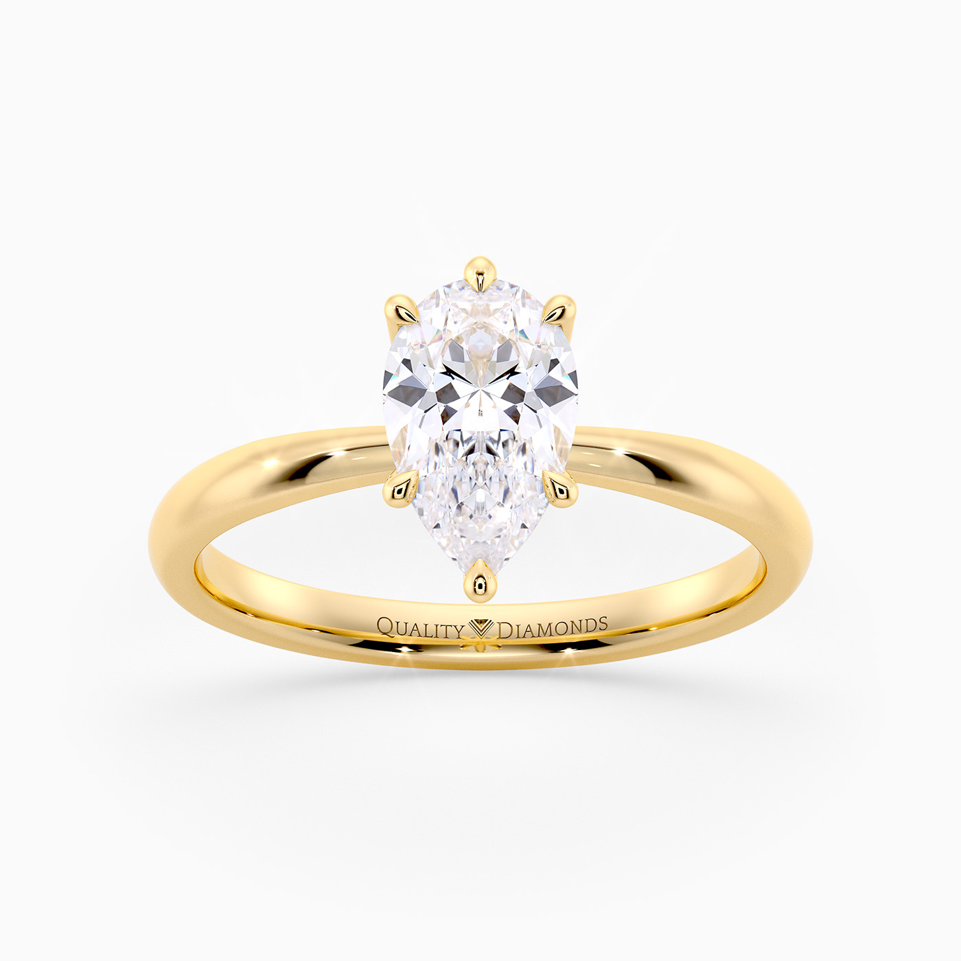 Our classic 9K Yellow Gold solitaire Mirabelle holds the Pear diamond in an elegant V-shaped six-claw setting, securely cradling the diamond while allowing plenty of light to enter from the sides. The elevated, open setting enhances the stones brilliance and creates a timeless, sophisticated look with simple, flowing lines.