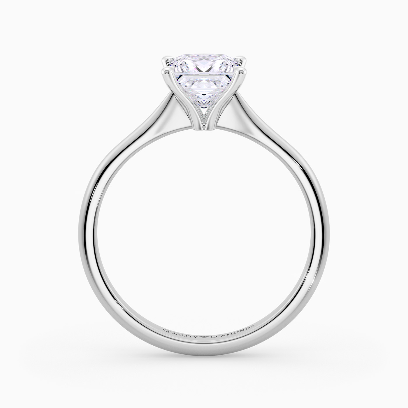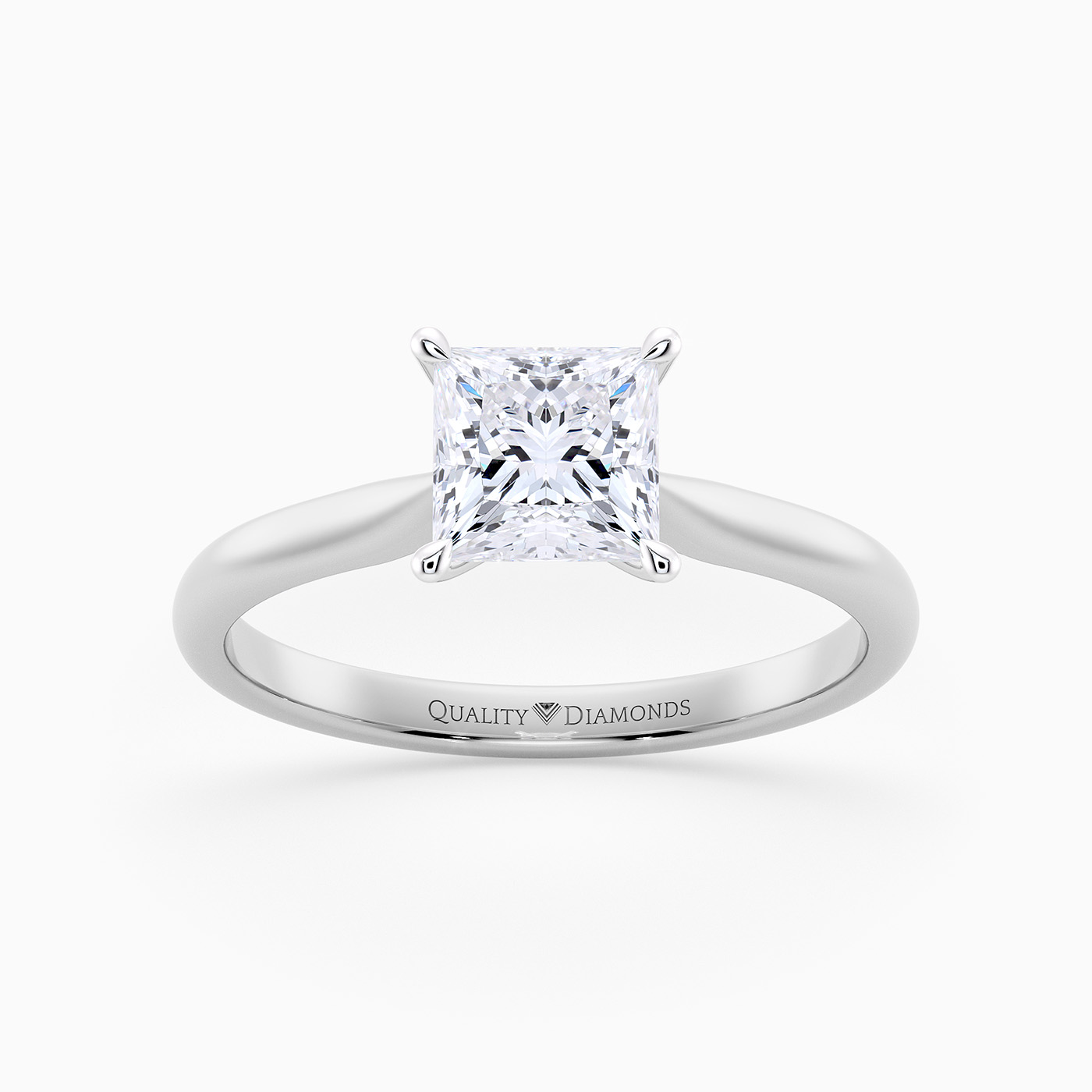 Our classic Platinum solitaire Beau features an elegant four-claw setting to secure the Princess diamond, with the claws creating a V shape from the side detail to complement the sparkle. With no side bezel, this setting truly maximises the amount of light able to pass through the diamond.