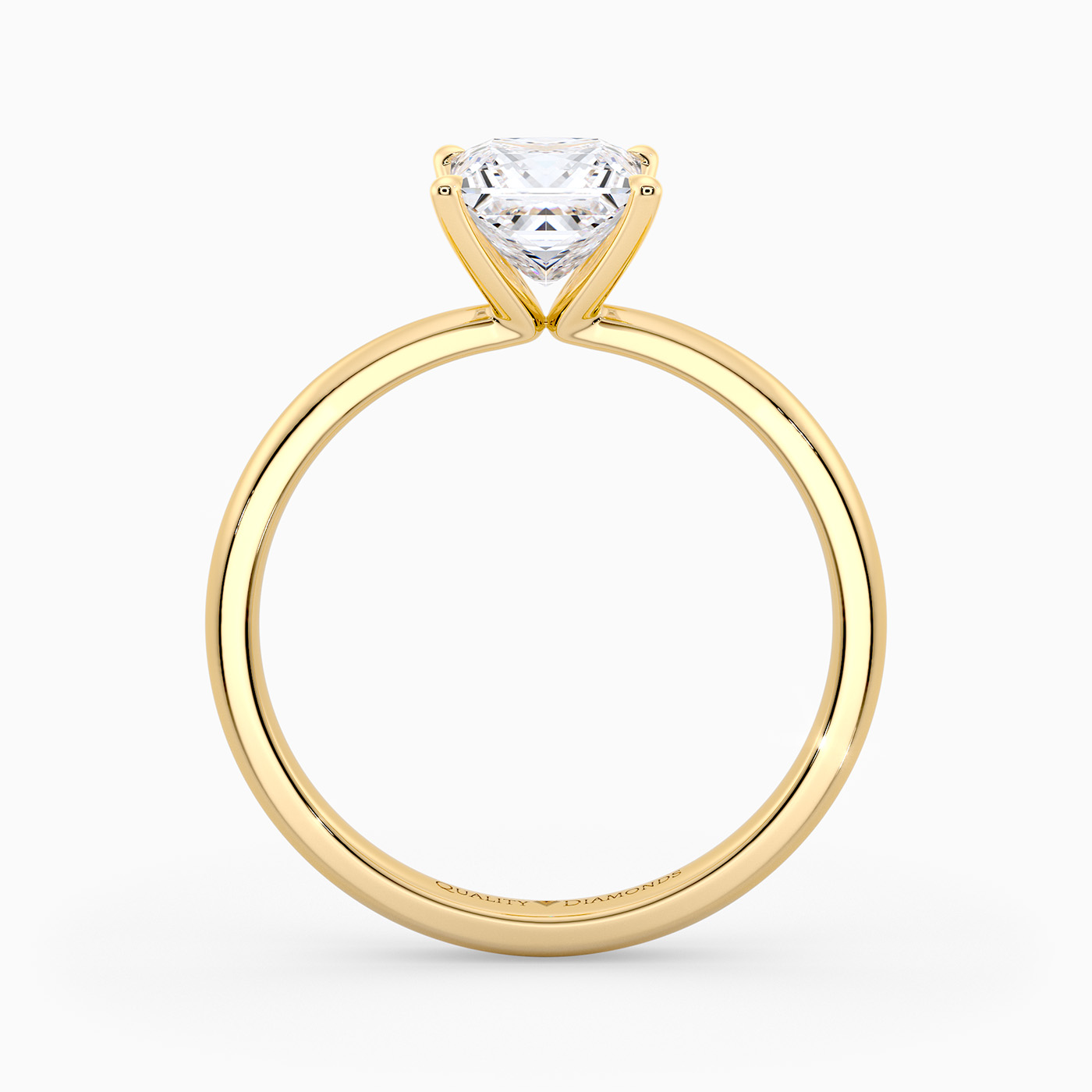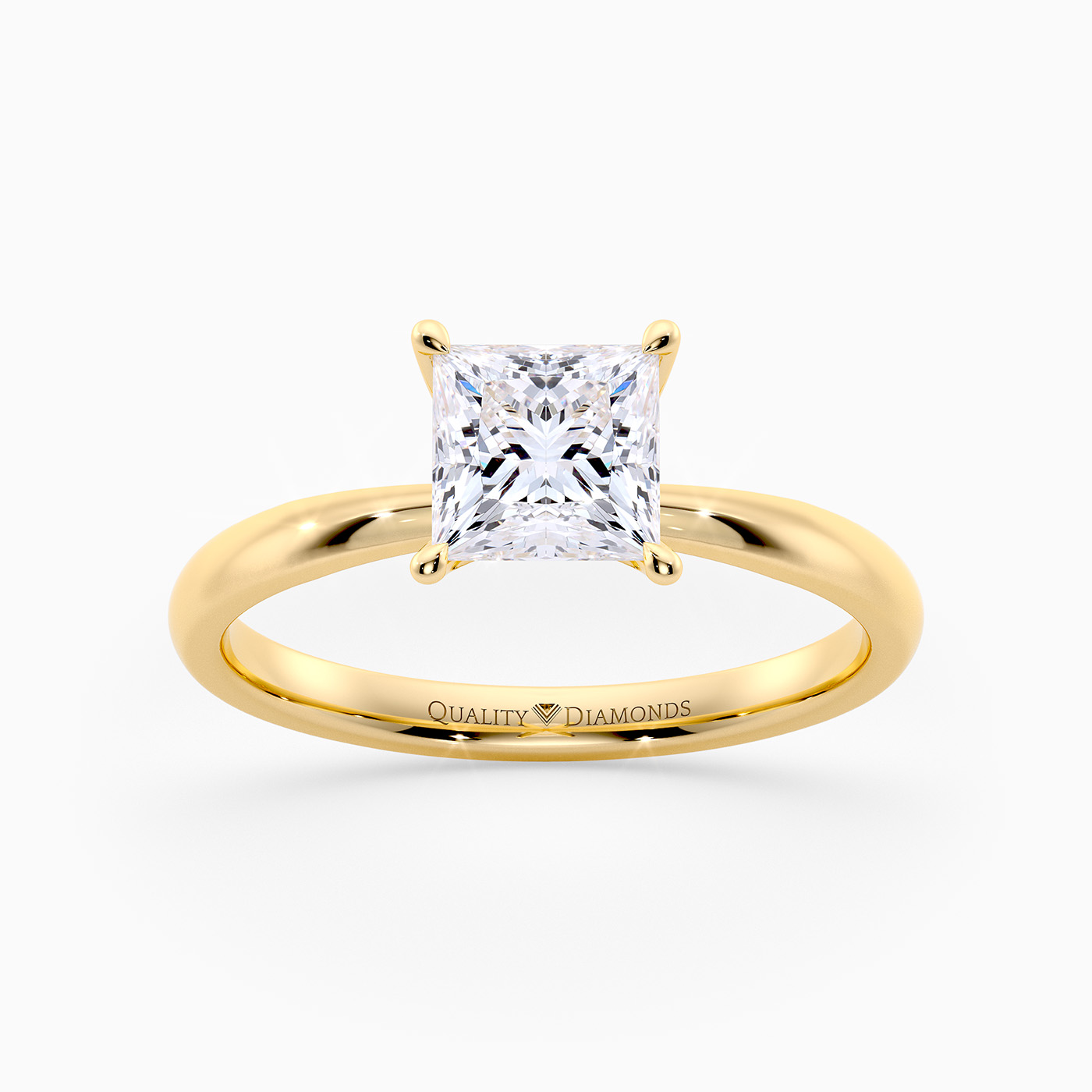 Our classic 9K Yellow Gold solitaire Mirabelle holds the Princess diamond in an elegant V-shaped four-claw setting, securely cradling the diamond while allowing plenty of light to enter from the sides. The elevated, open setting enhances the stones brilliance and creates a timeless, sophisticated look with simple, flowing lines.