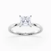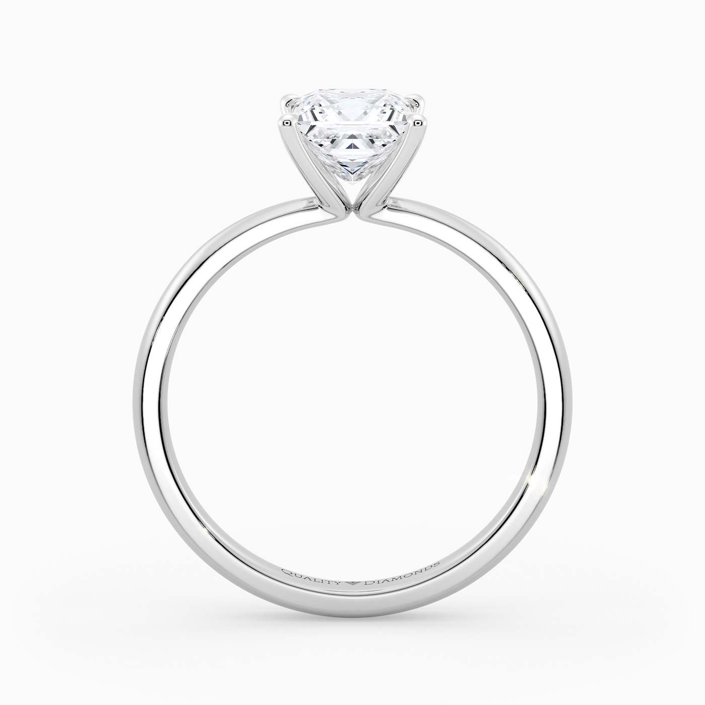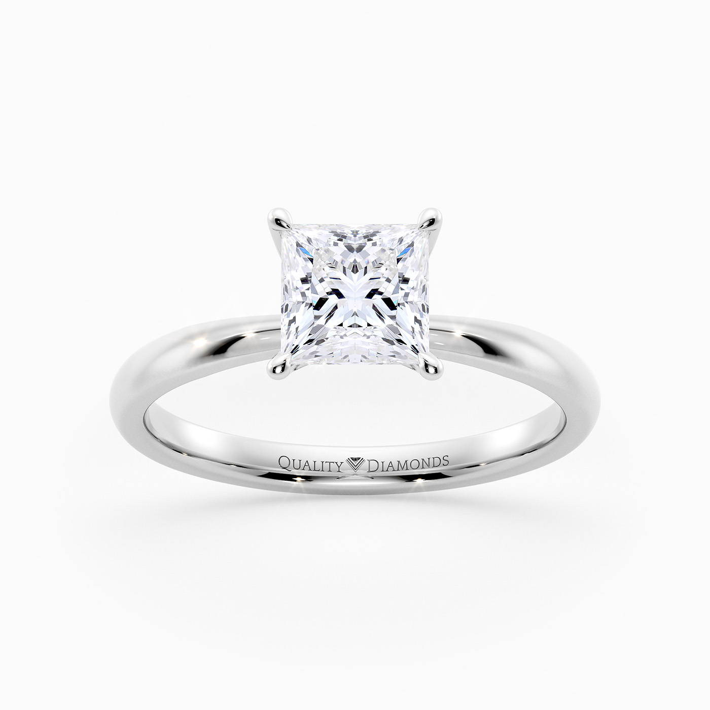 Our classic Platinum solitaire Mirabelle holds the Princess diamond in an elegant V-shaped four-claw setting, securely cradling the diamond while allowing plenty of light to enter from the sides. The elevated, open setting enhances the stones brilliance and creates a timeless, sophisticated look with simple, flowing lines.