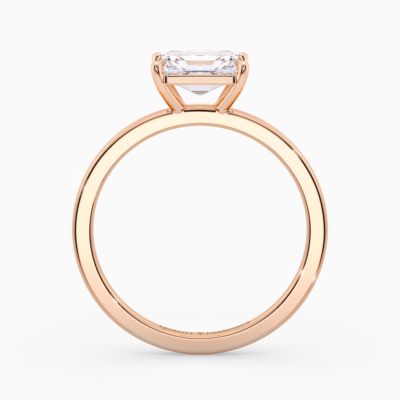 This elegant Radiant east-west style 18K Rose Gold Amada four-claw solitaire ring features a raised gallery that allows any wedding band to sit flush for a perfect fit.