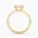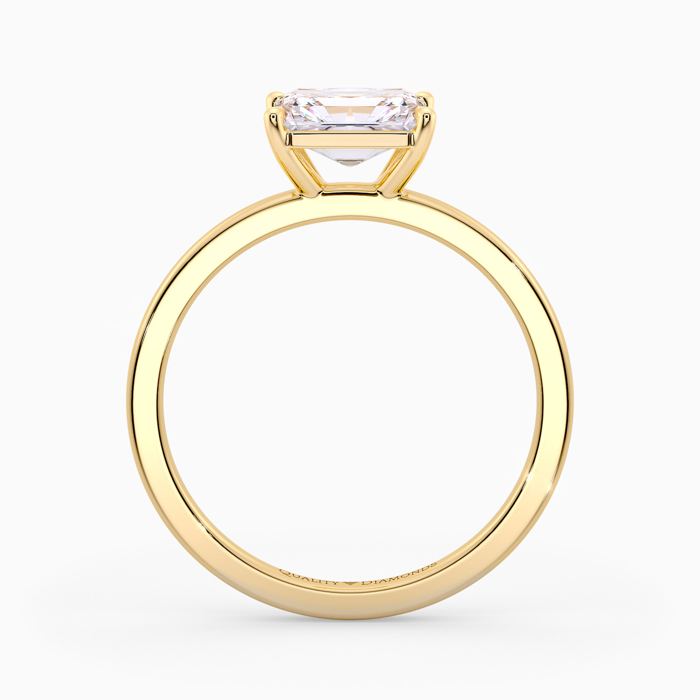 This elegant Radiant east-west style 18K Yellow Gold Amada four-claw solitaire ring features a raised gallery that allows any wedding band to sit flush for a perfect fit.