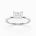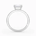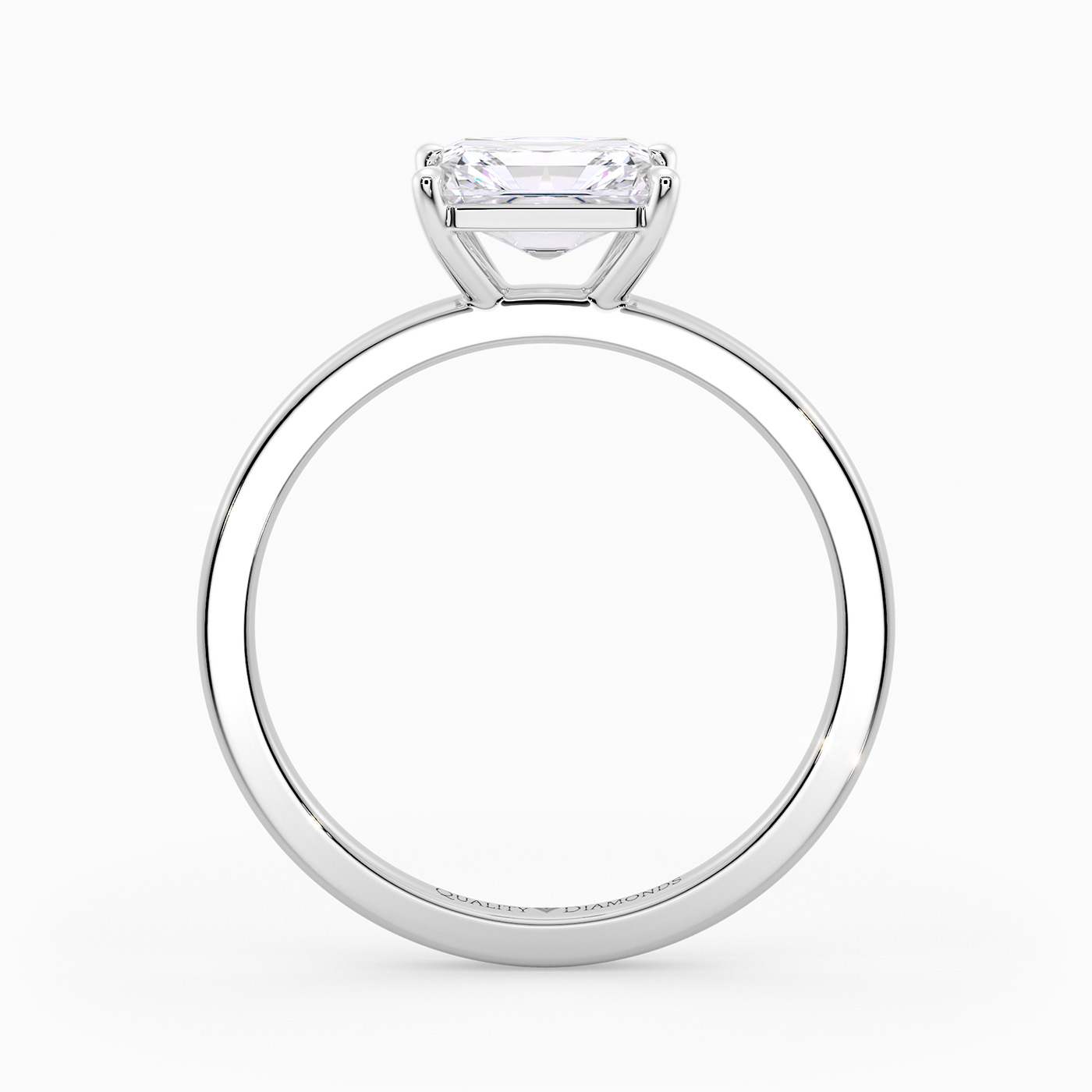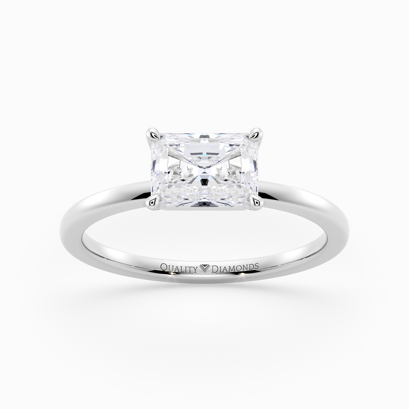 This elegant Radiant east-west style Platinum Amada four-claw solitaire ring features a raised gallery that allows any wedding band to sit flush for a perfect fit.