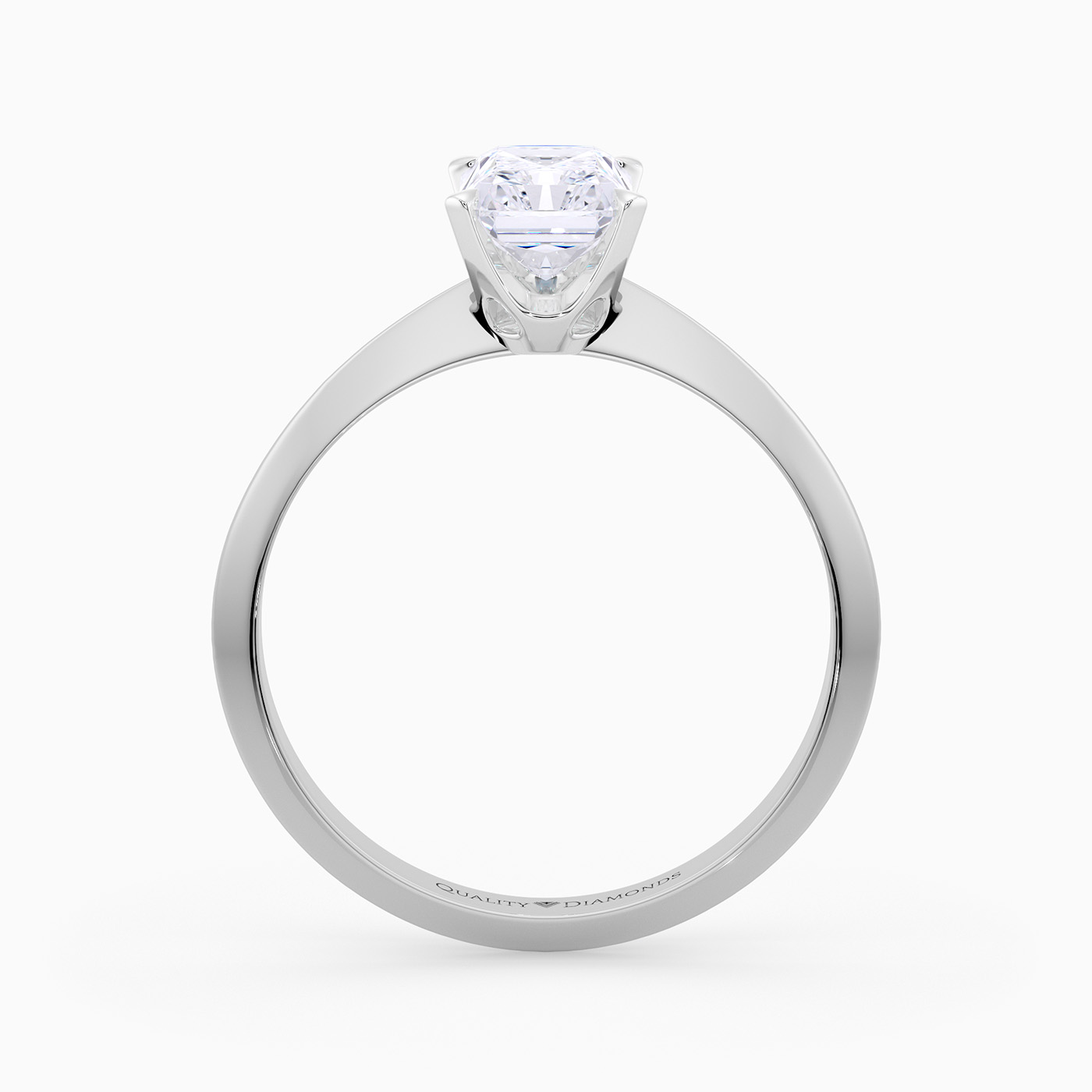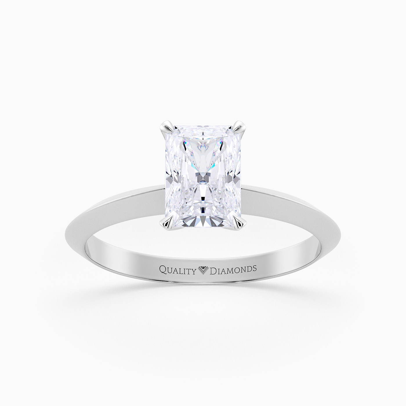 Our classic Platinum solitaire Carella holds the Radiant diamond proudly in a secure four-claw setting, to complement the sparkle. The shoulders taper to a knife-edge, elevating the diamond to fully display its dramatic beauty.