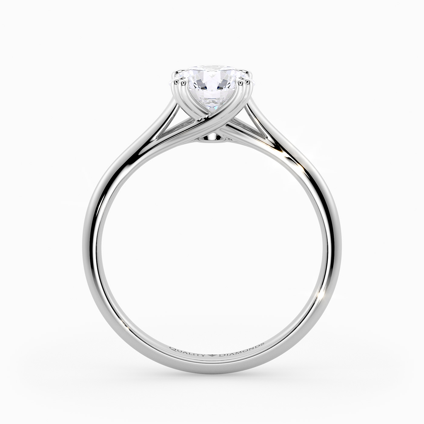 Our classic 18K White Gold solitaire Amore features a fluid, crossed, double-heart four-claw setting that holds the Round Brilliant diamond, leaving the sides of the diamond beautifully exposed.