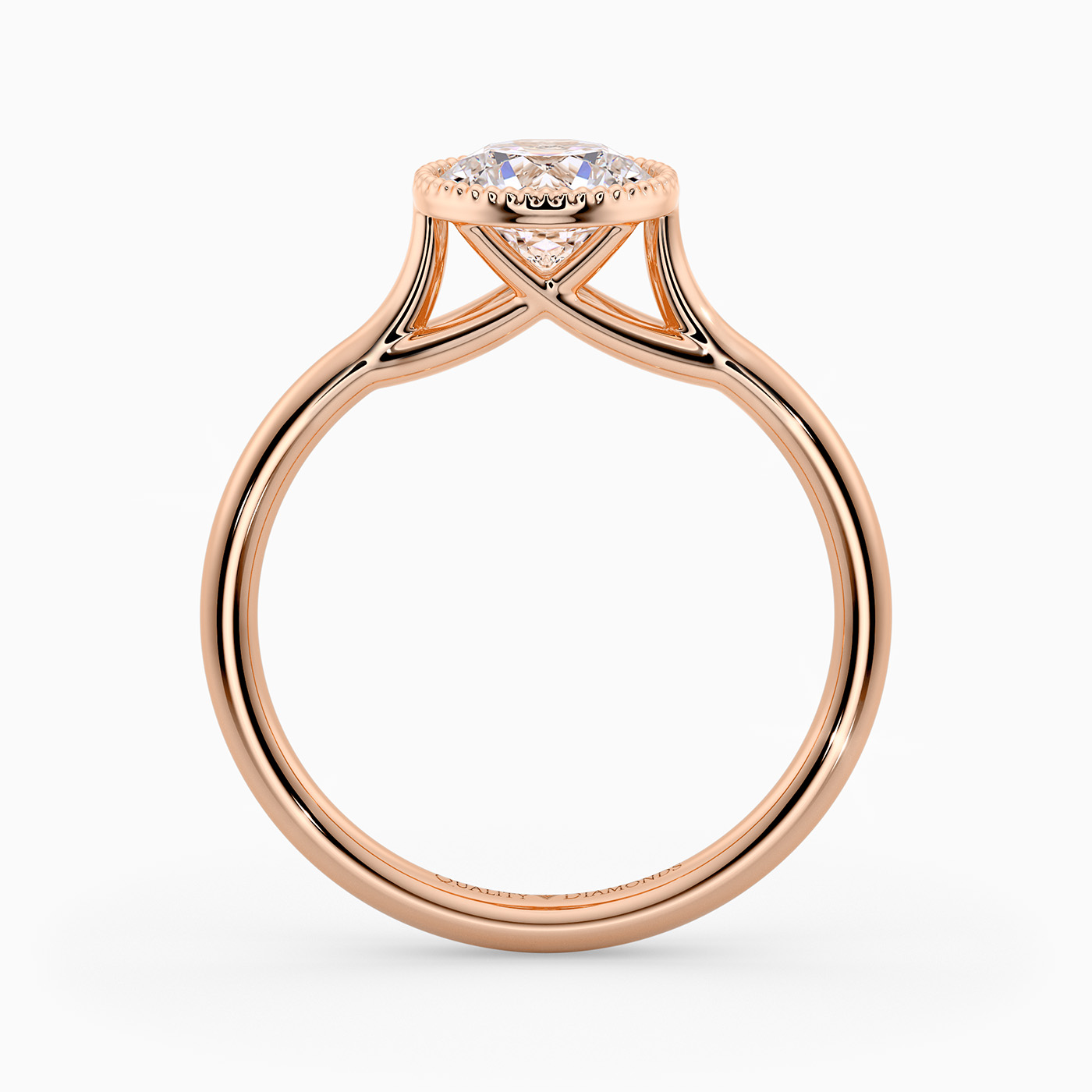 Our contemporary 9K Rose Gold solitaire Aura holds the Round Brilliant diamond securely in a bezel-set setting, with milgrain accents for a unique look. The band delicately crosses and gently tapers into the diamond, drawing your eye to the beautiful sparkle.